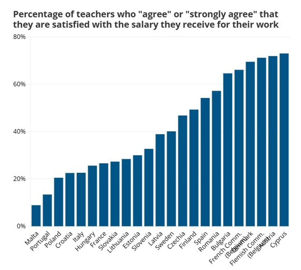 Në Austri, komunitetet flamen dhe frankofone të Belgjikës, Bullgari dhe Danimarkë, më shumë se tre në pesë mësues thonë se paga e tyre është e mjaftueshme.