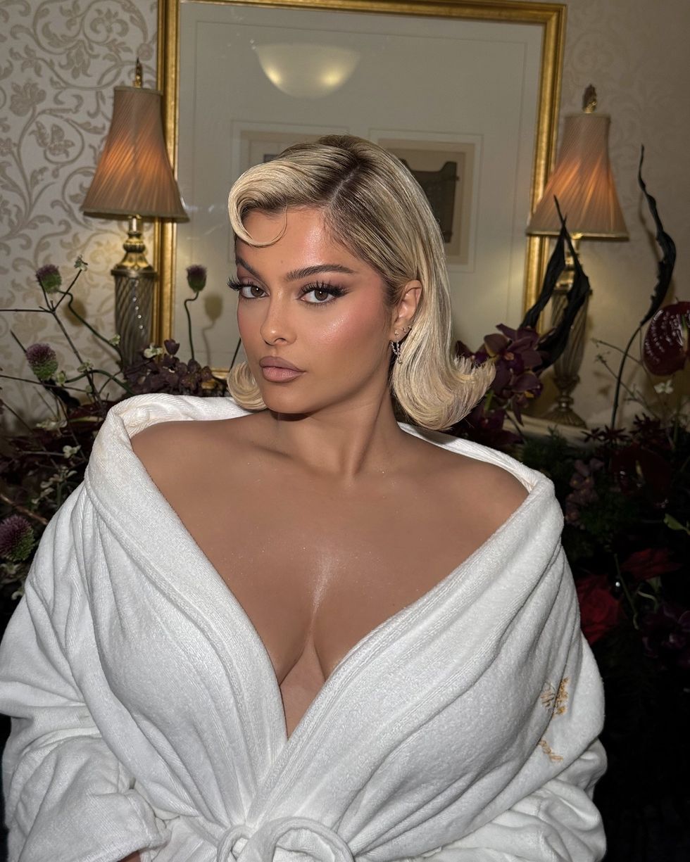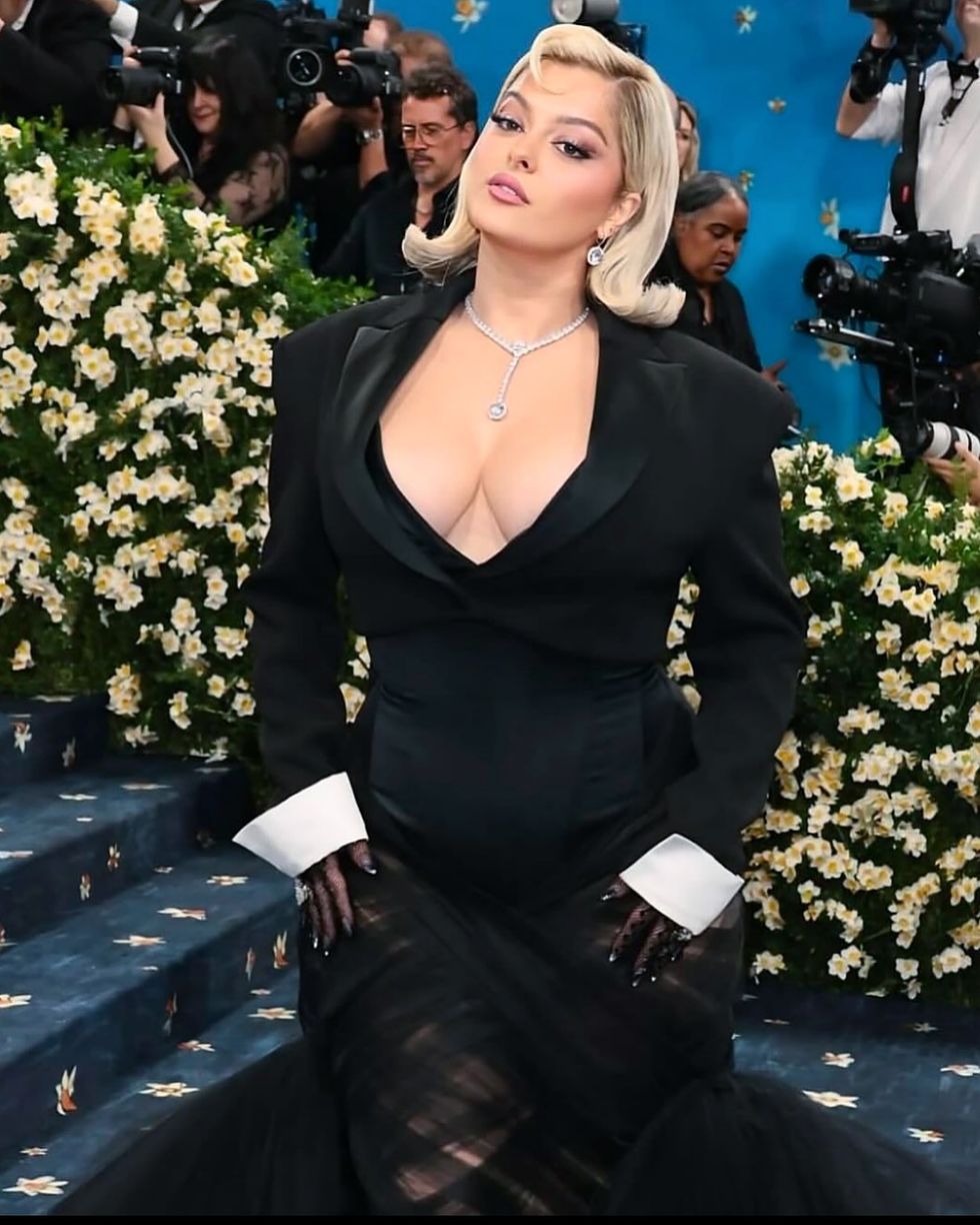 Pamjen e kompletoi me doreza rrjete të zeza dhe bizhuteri me shkëlqim, përfshirë një varëse të gjatë me diamante që i jepte edhe më shumë hijeshi.