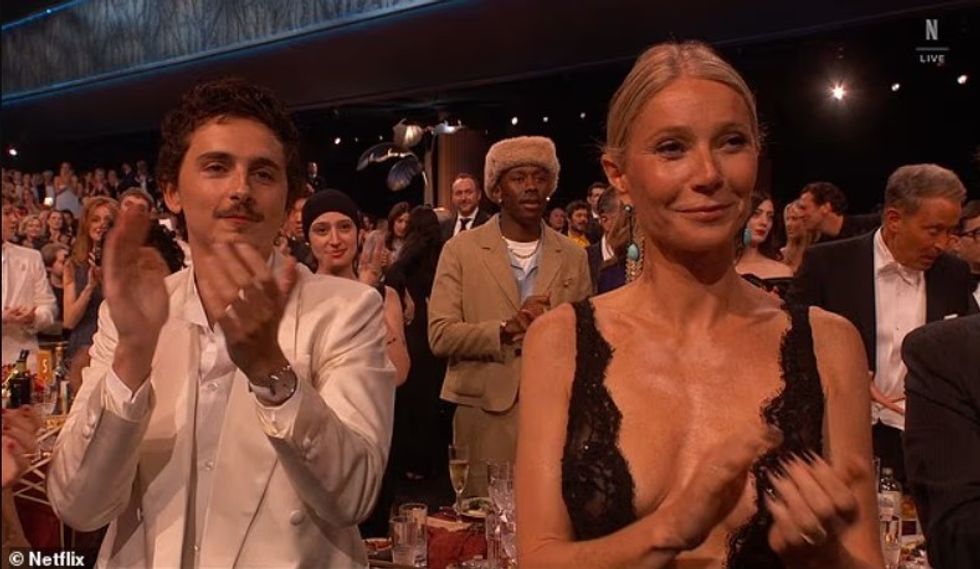 Ylli 39-vjeçar mbeti i përlotur dhe i habitur teksa mori trofeun, ndërsa Chalamet u ngrit në këmbë për ta duartrokitur, së bashku me Gwyneth Paltrow, shkruan DailyMail.