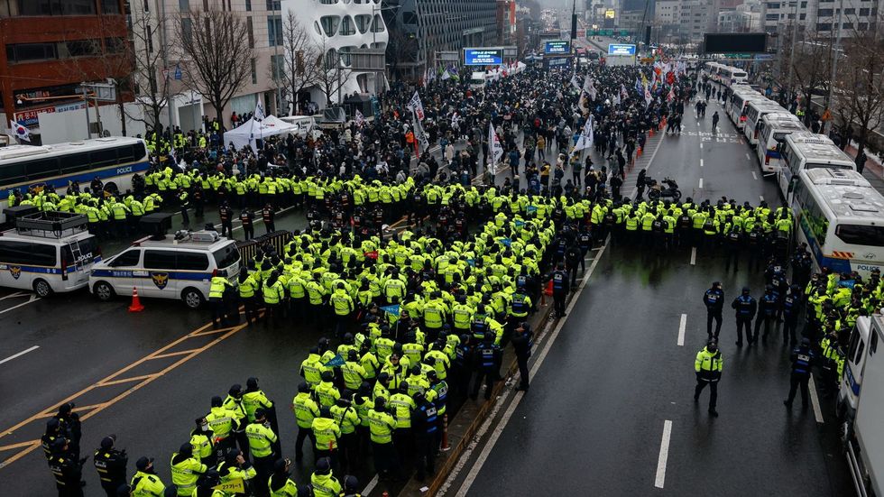 Përpara mandateve që skadonin në mesnatën e së hënës, mijëra protestues anti-Yoon u mblodhën pranë portave të rezidencës presidenciale të dielën, ndërsa grupet pro-Joon u mblodhën në një rrugë aty pranë. Ata u ndanë nga barrikadat e policisë.