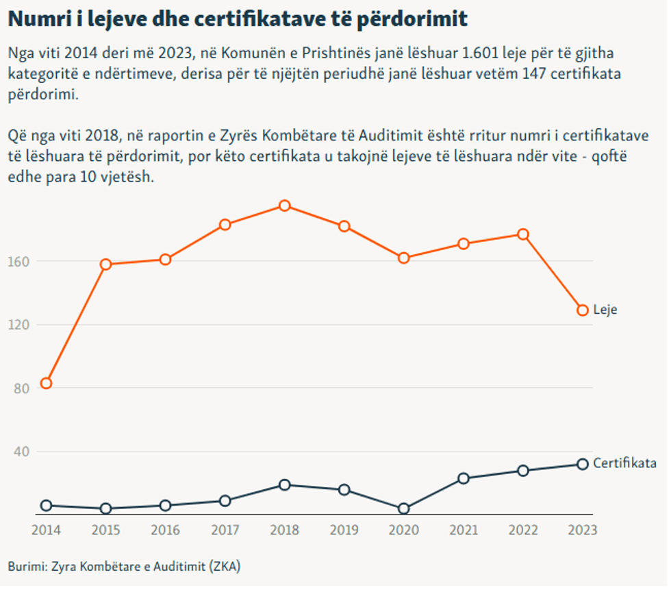 Ndërkohë, në periudhën 2014-2023, Komuna e Prishtinës ka lëshuar gjithsej 1.601 leje ndërtimore, por vetëm 147 prej tyre kanë përfunduar me certifikatë të përdorimit.