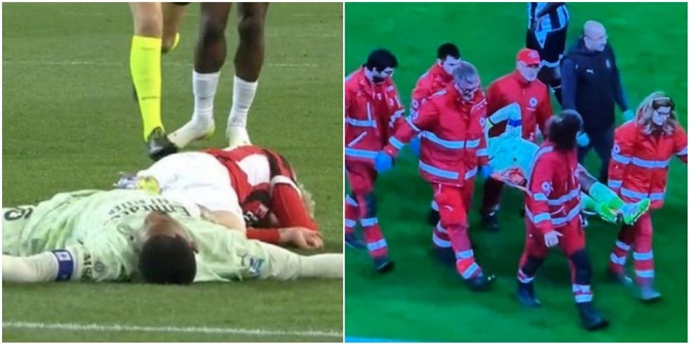 Reprezentuesi francez doli nga porta e tij në përpjekje për ta spastruar një top me kokë, por fatkeqësisht ai u përplas me kolegun e tij dhe u detyrua të largohet nga fusha me barelë.