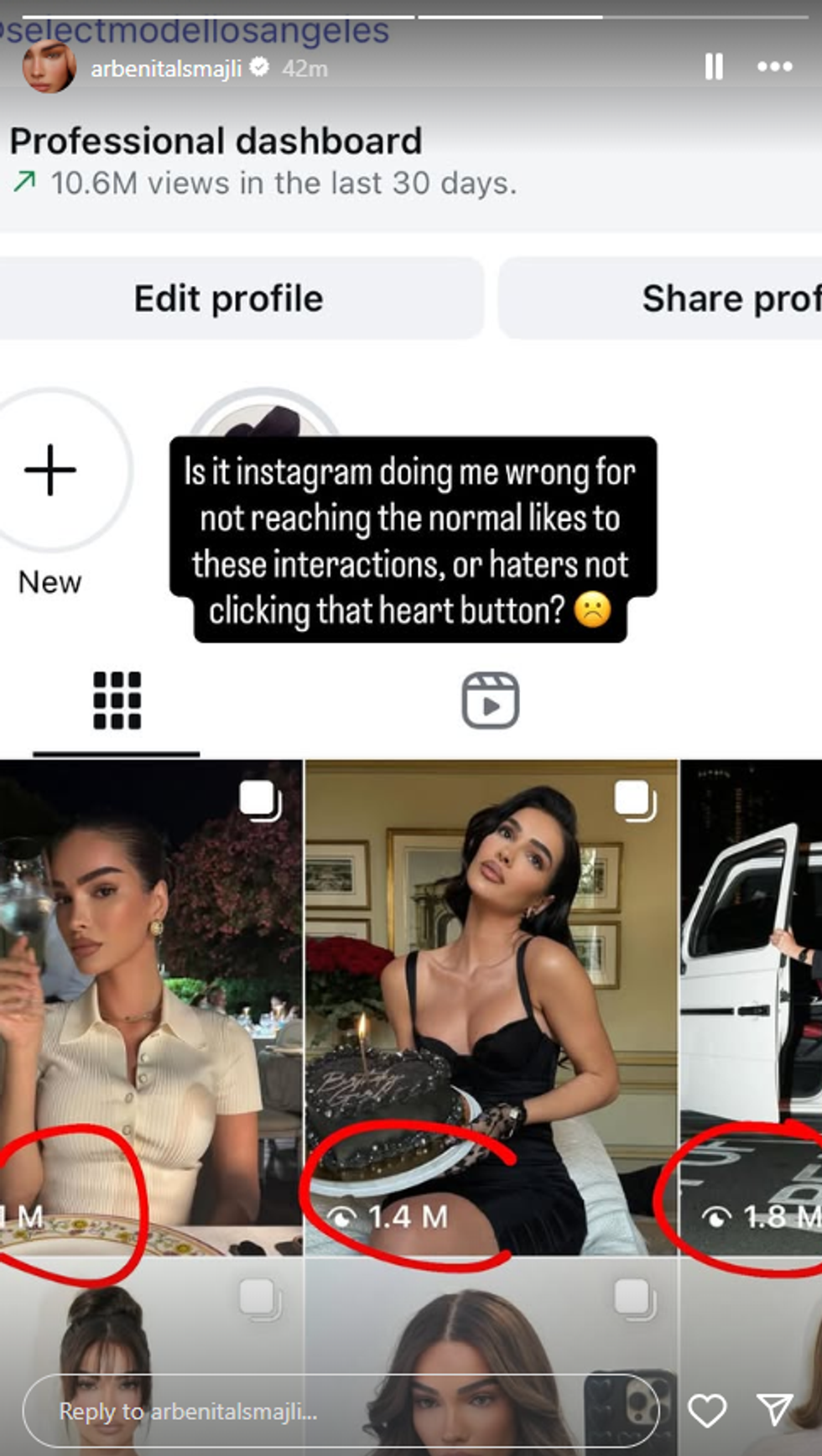 Ajo publikoi një fotografi ku shihej se kishte mbi 10.6 milionë shikime vetëm në 30 ditët e fundit, por numri i pëlqimeve në postime nuk po përputhej me këto shifra.