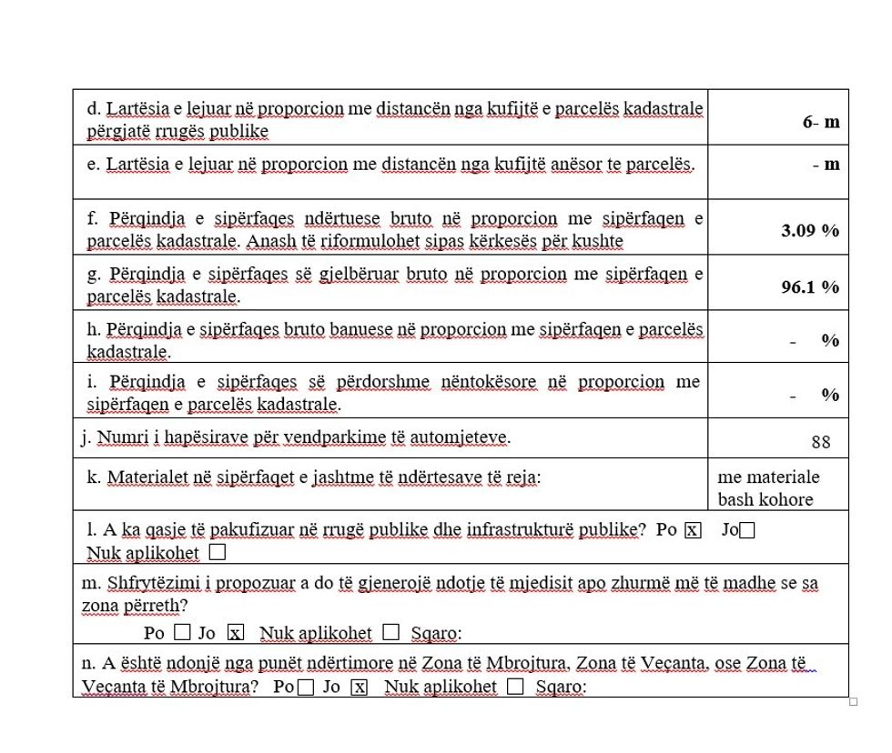 Siç thuhet në njoftim, nga vlerësimet paraprake, shfrytëzimi i propozuar nuk pritet të gjenerojë ndotje të mjedisit apo zhurmë më të madhe se zona përreth, si dhe nuk parashihet ndërtim në zona të mbrojtura.