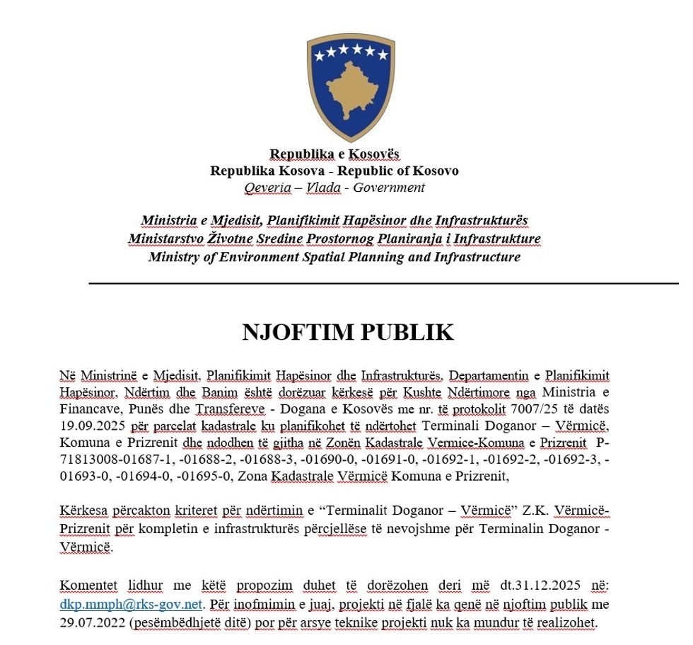 Ministria e Mjedisit, Planifikimit Hapësinor dhe Infrastrukturës (MMPHI) ka njoftuar hapjen e konsultimit publik lidhur me kërkesën për kushte ndërtimore për projektin e ndërtimit të Terminalit Doganor – Vërmicë, në Komunën e Prizrenit.