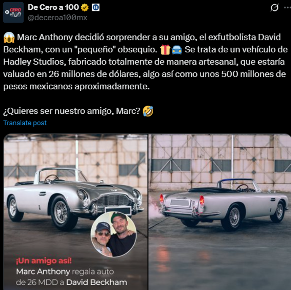 Marc Anthony dhe David Beckham kanë qenë miq prej shumë vitesh, dhe ndërsa kohët e fundit pati thashetheme se ata ishin në një sherr, këngëtari e mohoi këtë me një gjest të madh - i dhuroi atij një makinë me vlerë deri në 23 milionë euro.