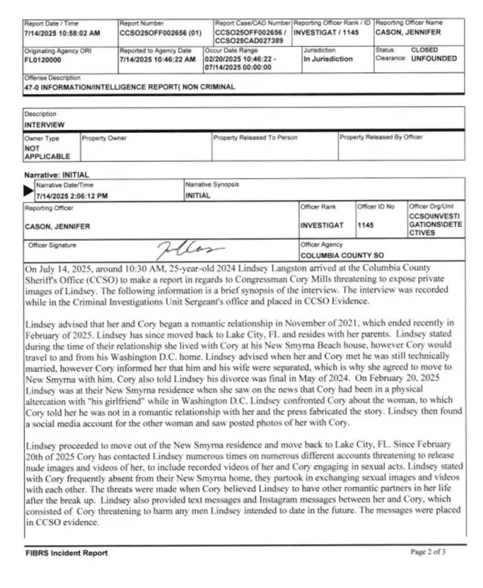 Langston, 25 vjeç, ka dorëzuar screenshot-e të mesazheve në tekst dhe në Instagram të dërguara nga Mills, të cilat më pas u futën në dosjen e provave dhe u dërguan për hetim të mëtejshëm në Departamentin e Zbatimit të Ligjit në Florida (FDLE), sipas një zëdhënësi të zyrës së sherifit.
