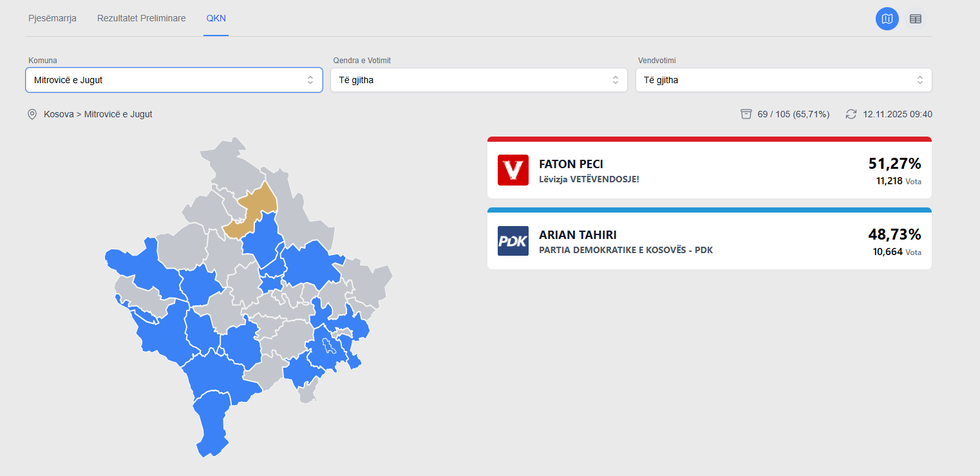 Kandidati i Lëvizjes Vetëvendosje, Faton Peci, është duke prirë me vota, ai deri tani ka marrë 11,218 vota apo 51.27%.