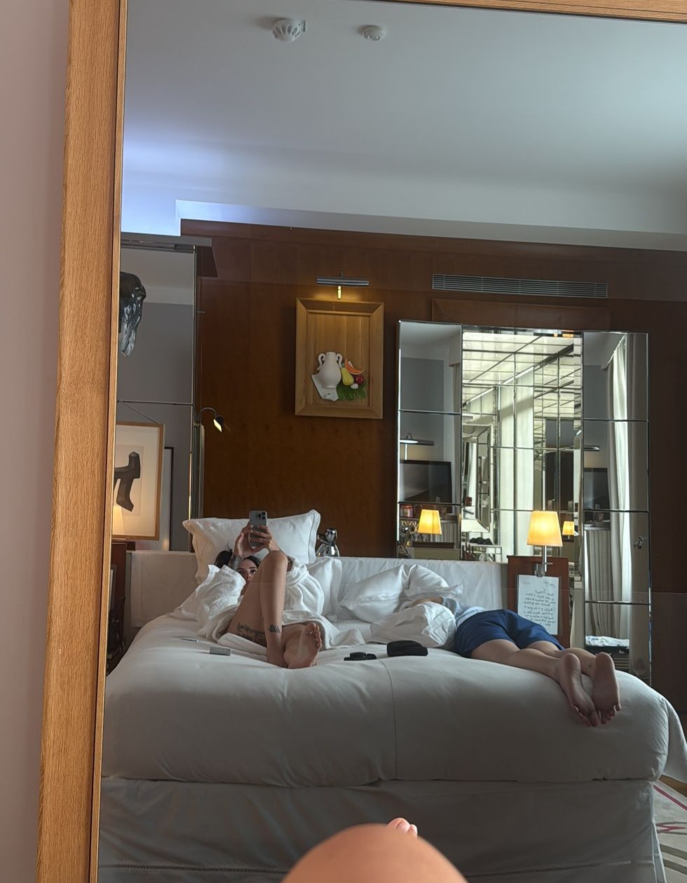 Dyshja duken të relaksuar dhe në momente intime, teksa fotoja është realizuar përmes pasqyrës që ndodhet përballë shtratit, duke krijuar një efekt të veçantë artistik dhe personal.