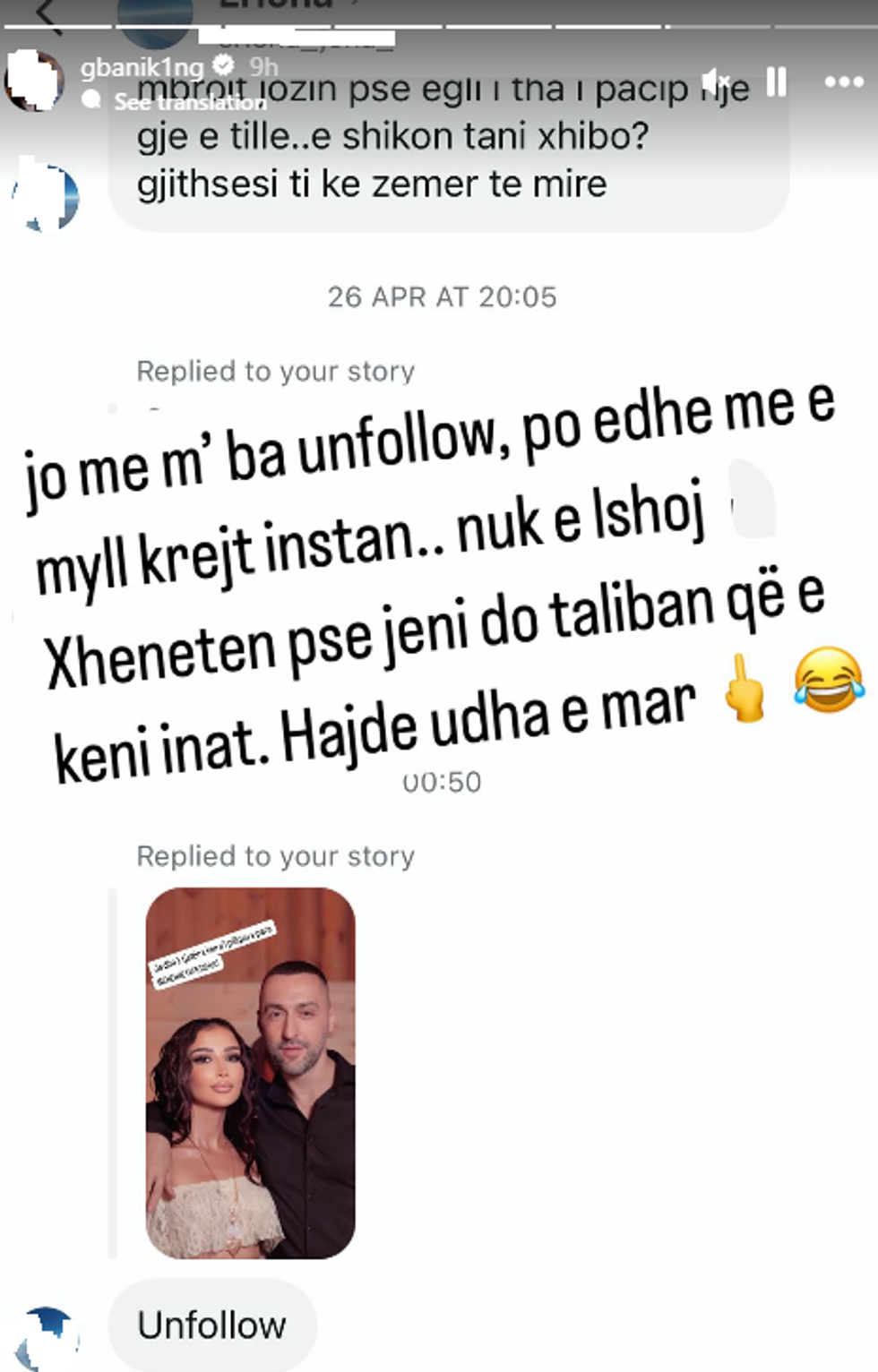 E reperi nga Shqipëria tha: “Jo me më bë unfolloë, po edhe më mbyll krejt Instagramin, nuk e lëshoj Xhenetën pse jeni disa talibanë që e keni inat. Hajde udha e mbarë”.