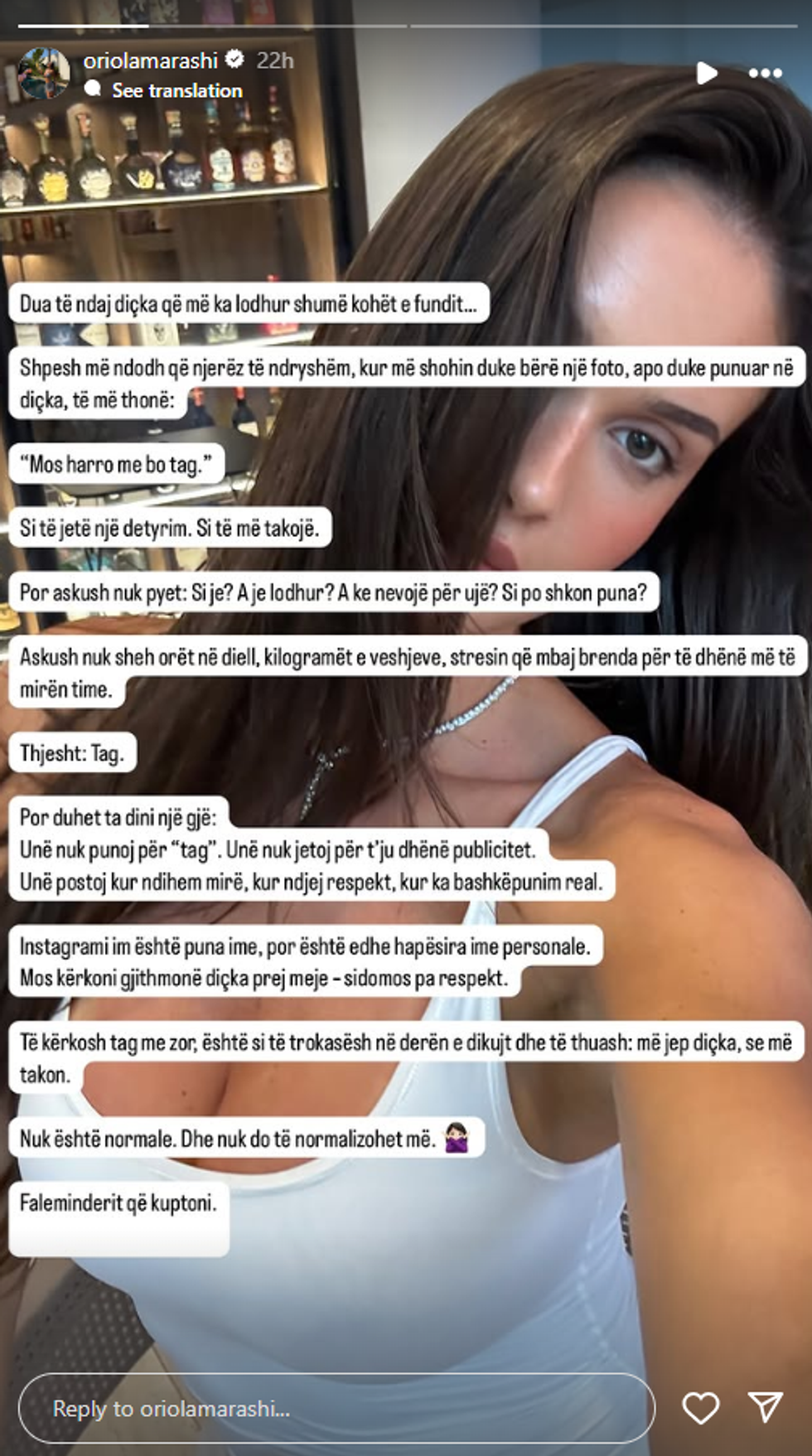 “Dua të ndaj diçka që më ka lodhur shumë kohët e fundit... Shpesh më ndodh që njerëz të ndryshëm, kur më shohin duke bërë një foto, apo duke punuar në diçka, të më thonë: ‘Mos harro me bo tag’. Si të jetë një detyrim. Si të më takojë. Por askush nuk pyet: Si je? A je lodhur? A ke nevojë për ujë? Si po shkon puna? Askush nuk sheh orët në diell, kilogramët e veshjeve, stresin që mbaj brenda për të dhënë më të mirën time. Thjesht: Tag”, e nisi reagimin ajo në ‘instastory’.