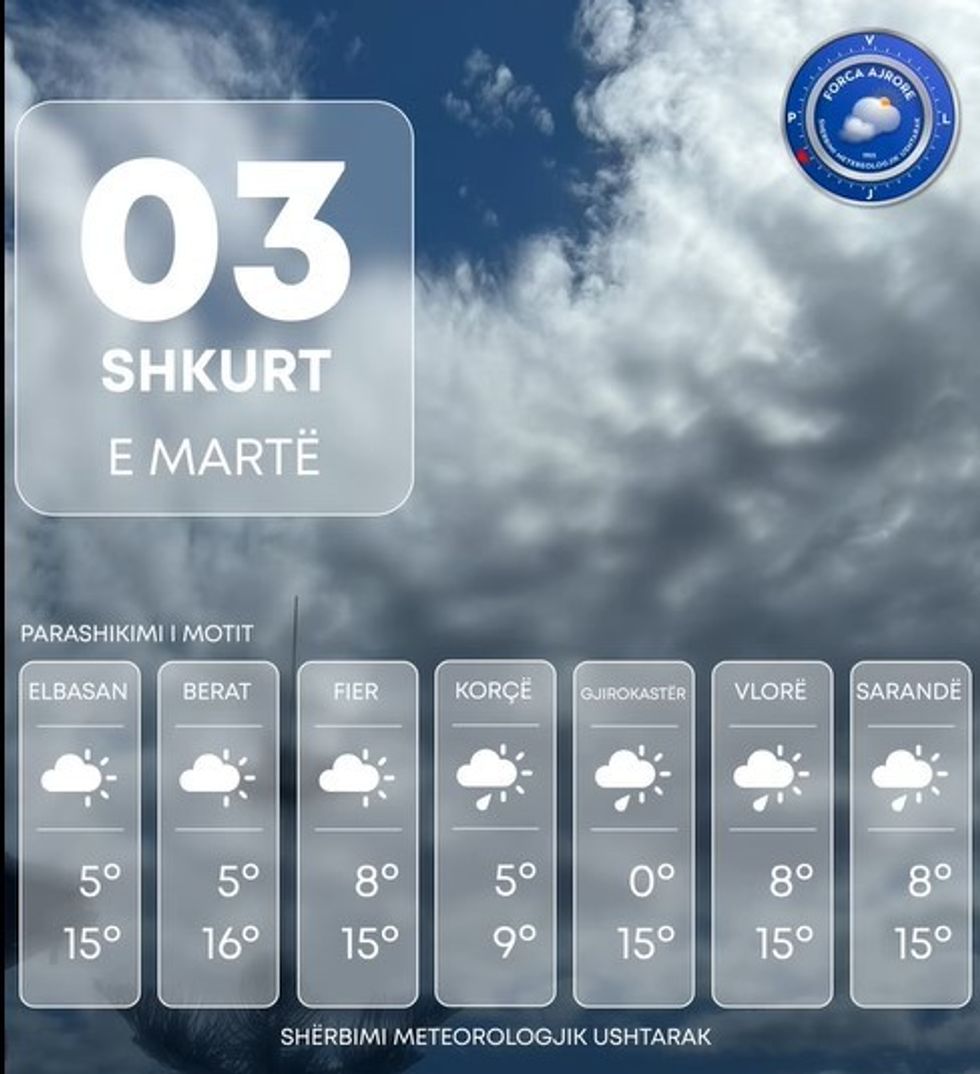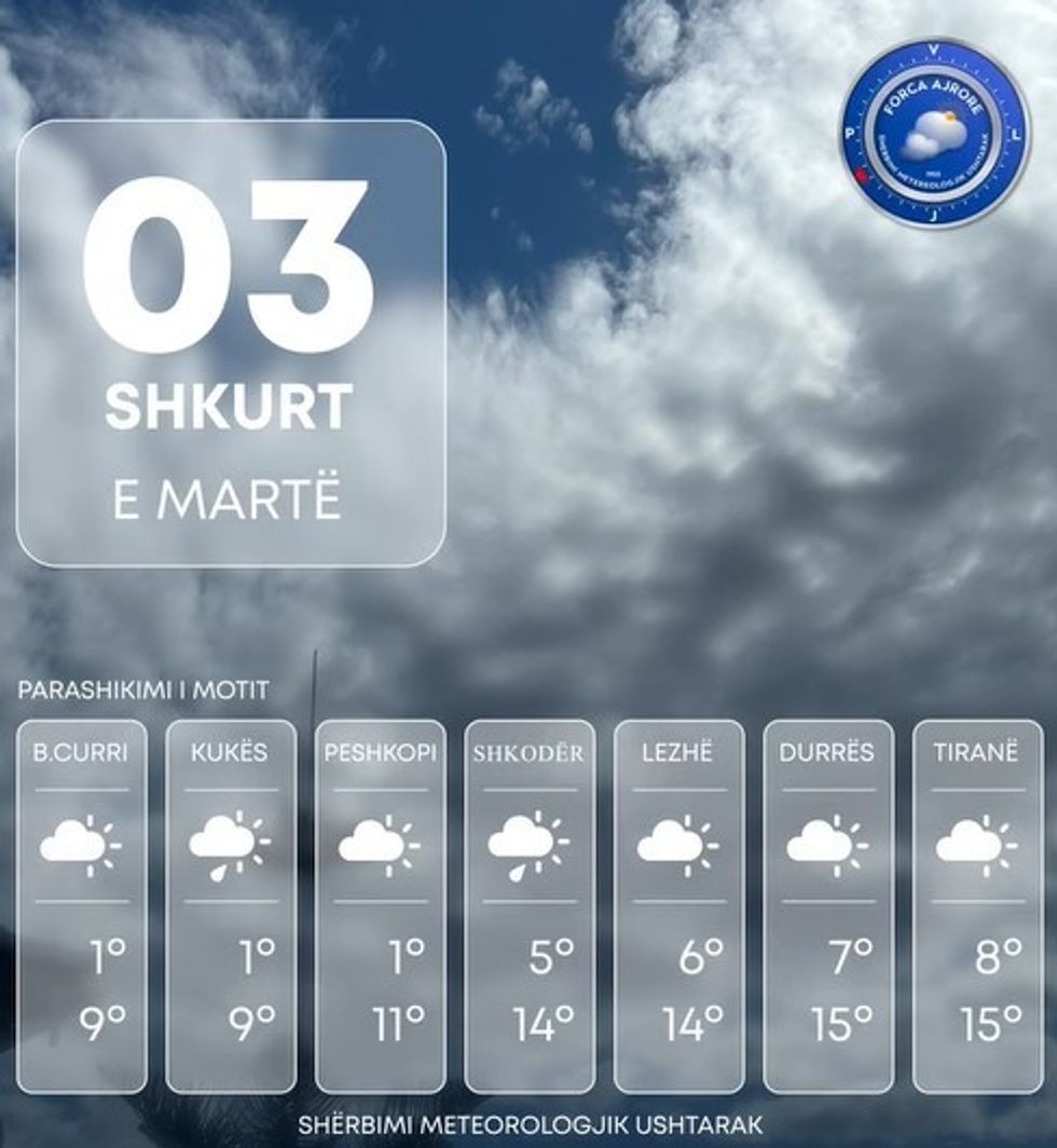 Shërbimi Meteorologjik Ushtarak bën të ditur se moti parashikohet me alternime vranësirash mesatare deri të dendura si dhe intervale të herëpashershme me kthjellime kryesisht përgjatë ultësirës perëndimore e në jug të vendit.
