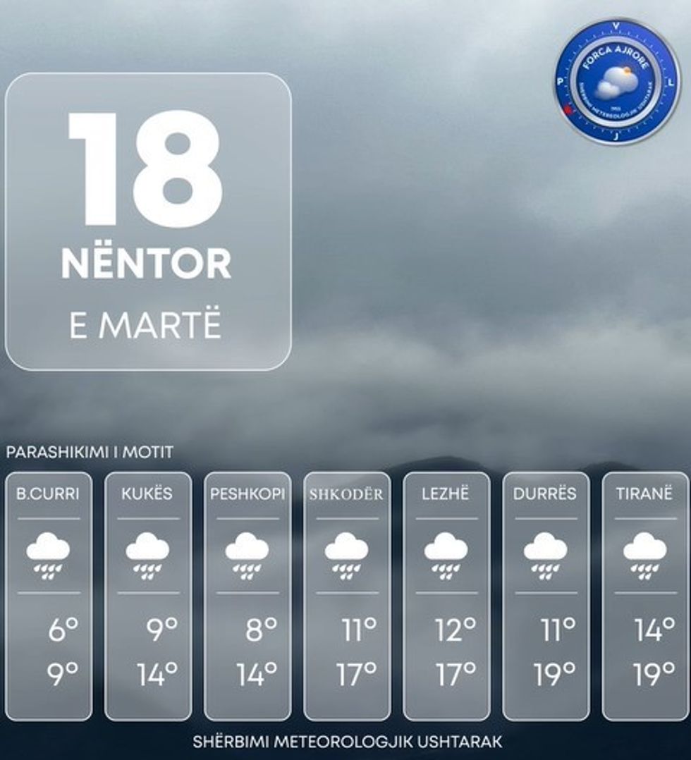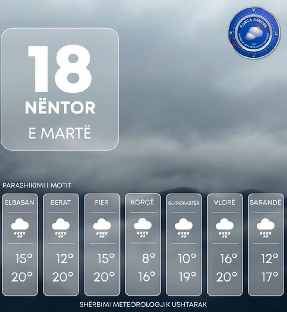 Reshjet e shiut do të vijojnë gjatë gjithë ditës të herëpashershme me intensitet të ulët dhe mesatar, ndërsa lokalisht pjesa perëndimore me reshje shiu me intensitet deri të lartë në formën e shtrëngatave dhe stuhive.