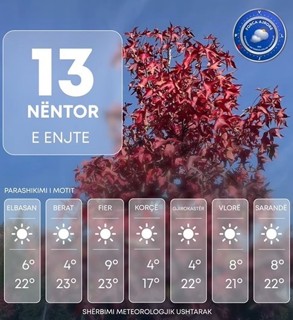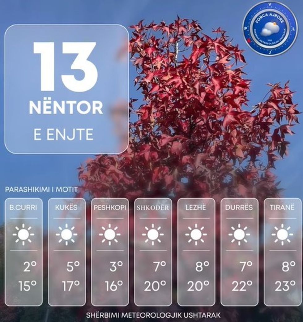 Shërbimi Meteorologjik bën të ditur se era do të fryjë me drejtim veriperëndim – verilindje me shpejtësi mesatare 5 m/s, ndërsa përgjatë vijës bregdetare e zonave luginore era fiton shpejtësi 10 m/s.