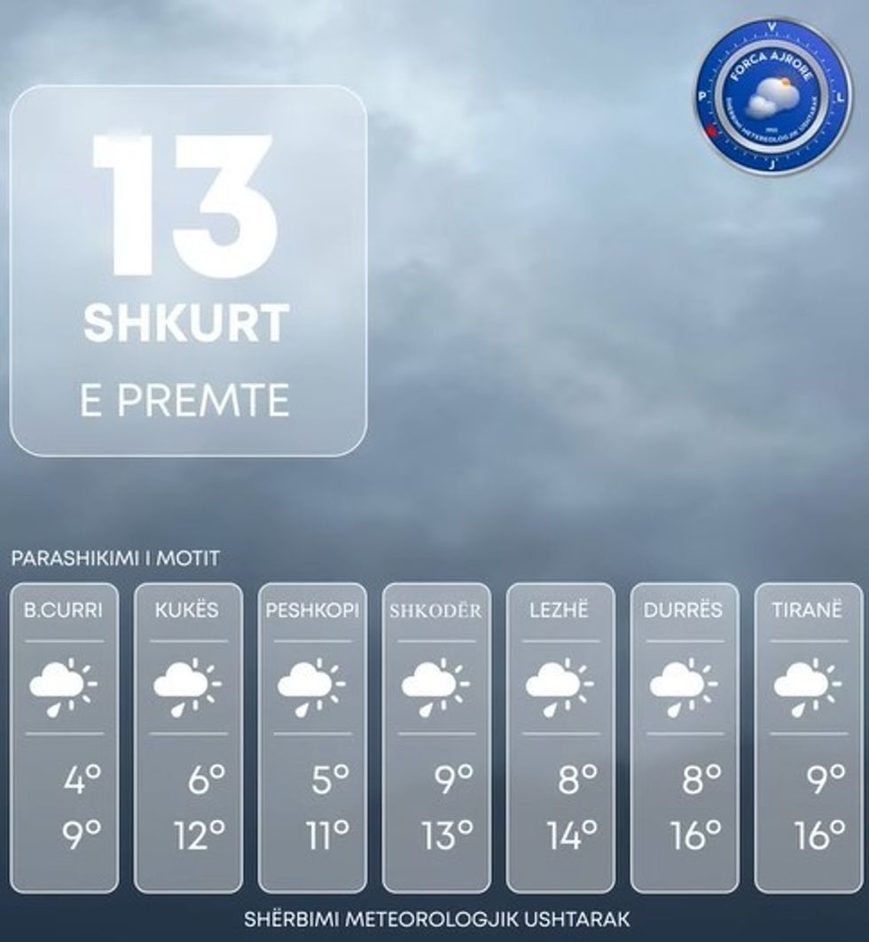 Në Shqipëri të premten do të mbaj mot i paqëndrueshëm, me vranësira mesatare deri të dendura, e alternime kthjellimesh, kryesisht pas mesdite.
