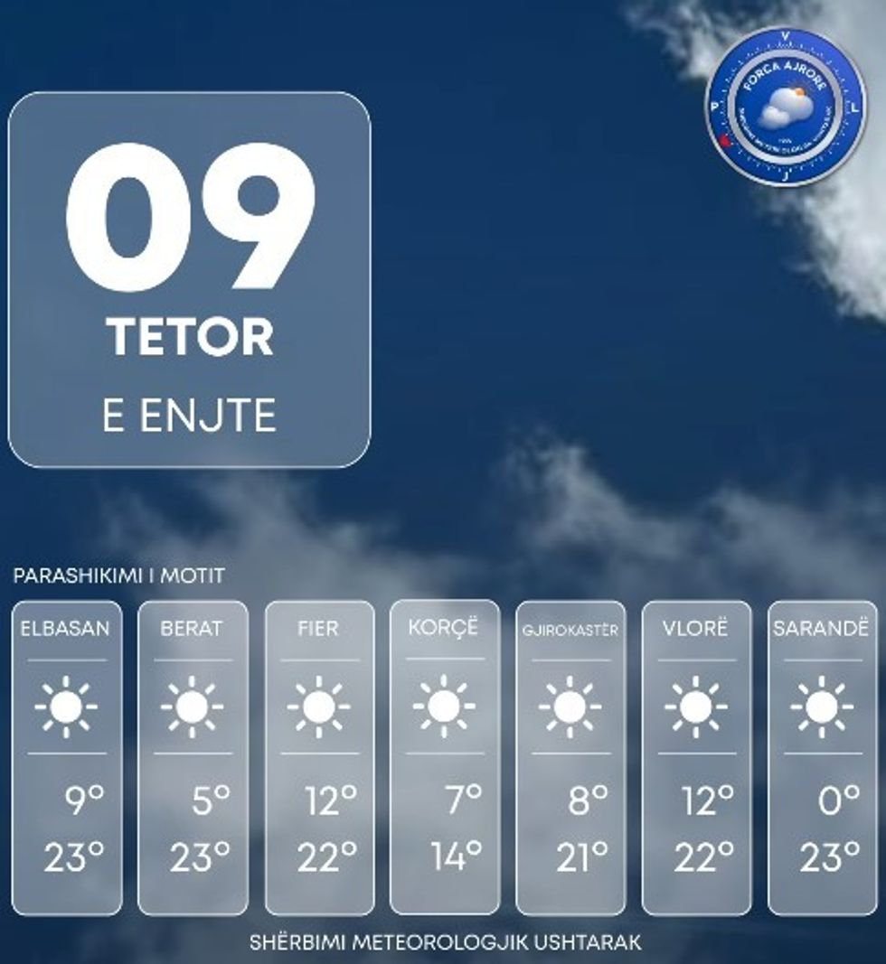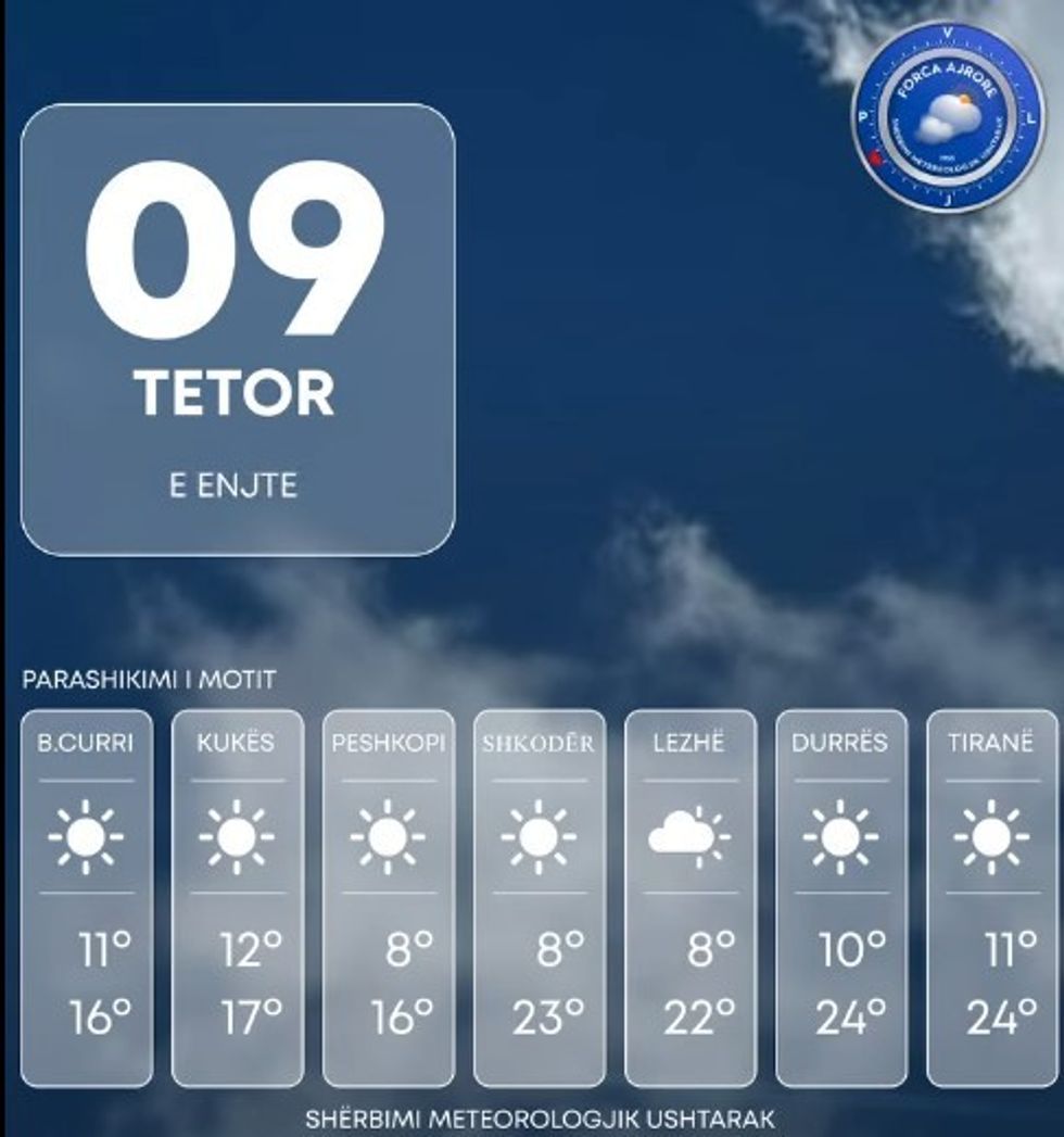 Shërbimi Meteorologjik Ushtarak bën të ditur se moti parashikohet i kthjellët dhe vranësira të pakta kalimtare në orët e mesditës.