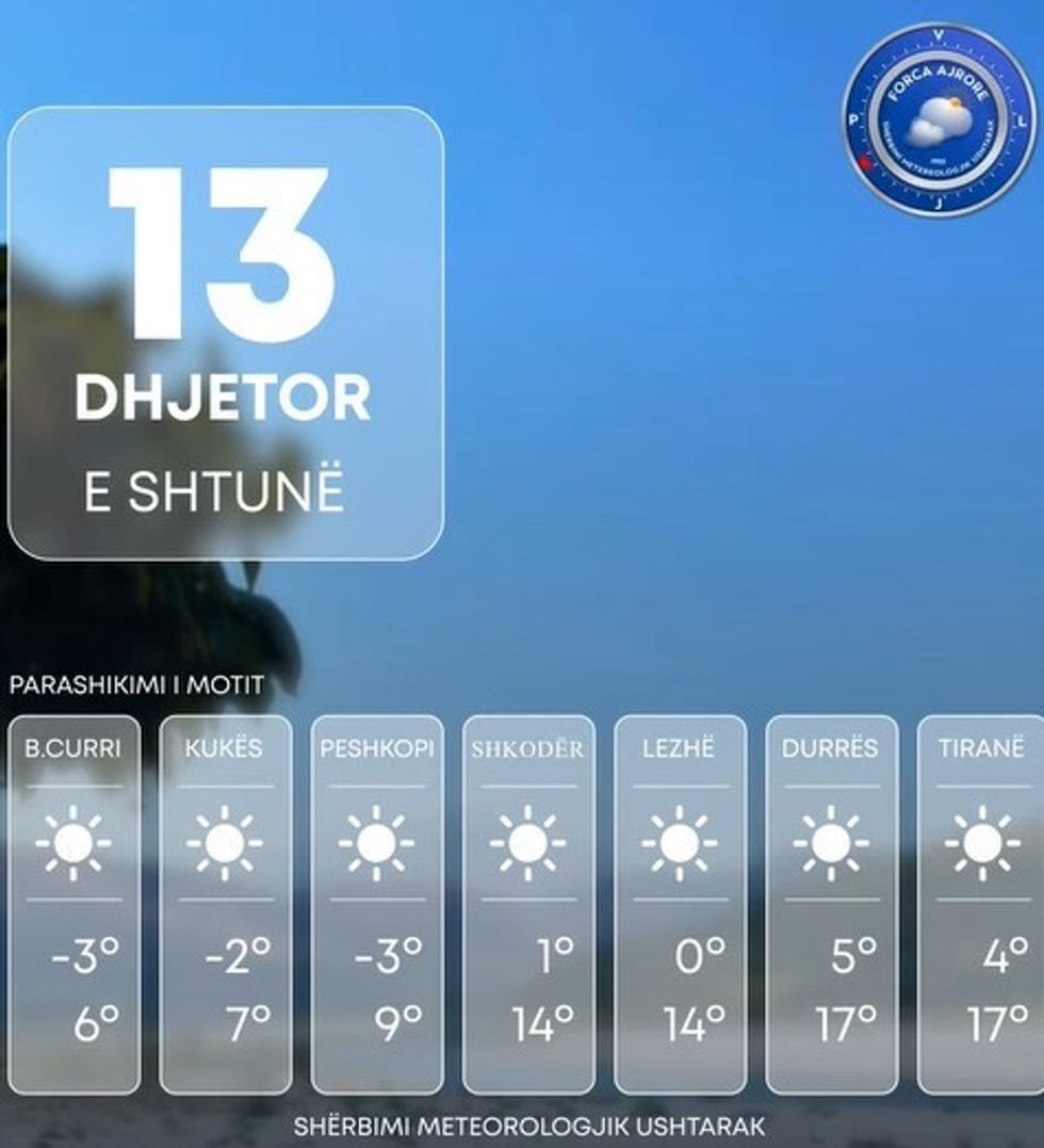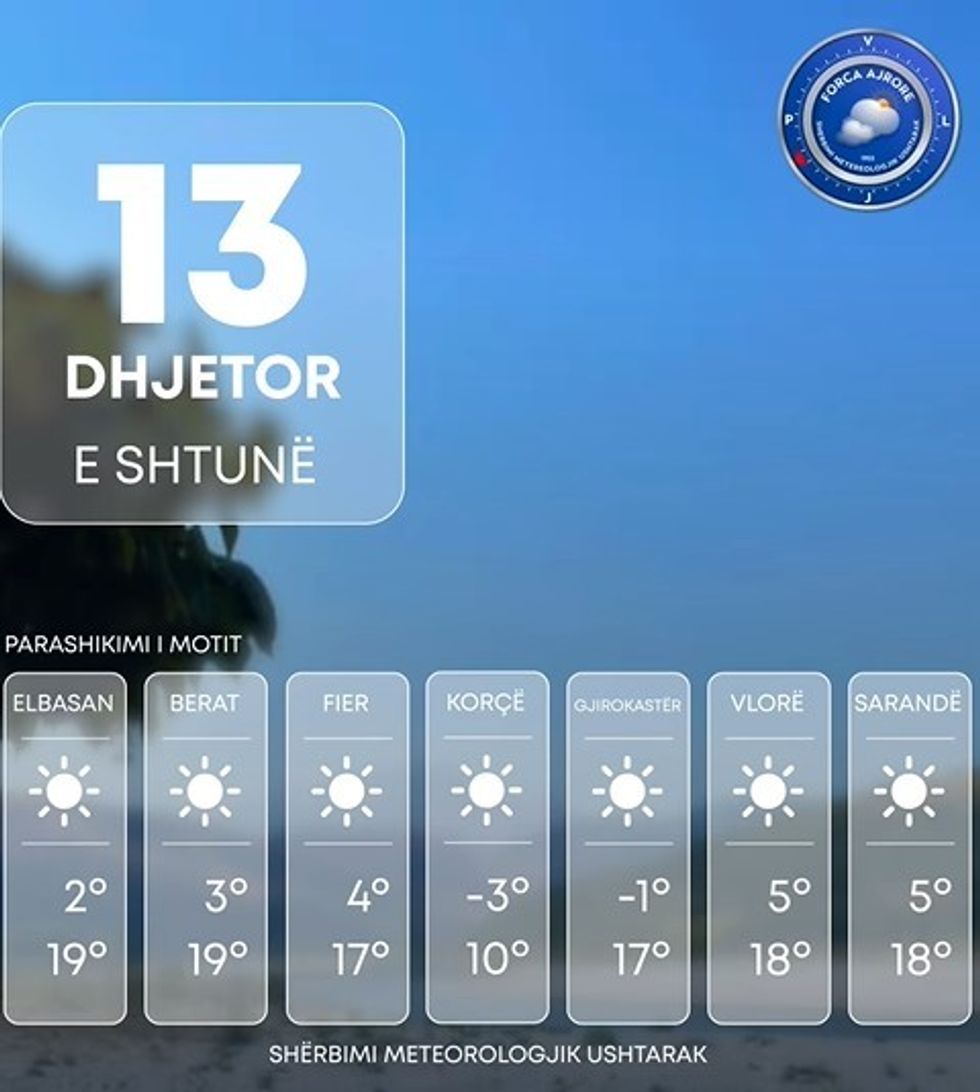 Shërbimi Meteorologjik Ushtarak bën të ditur se Shqipëria të shtunën do të ndikohet nga kushte atmosferike të qëndrueshme.