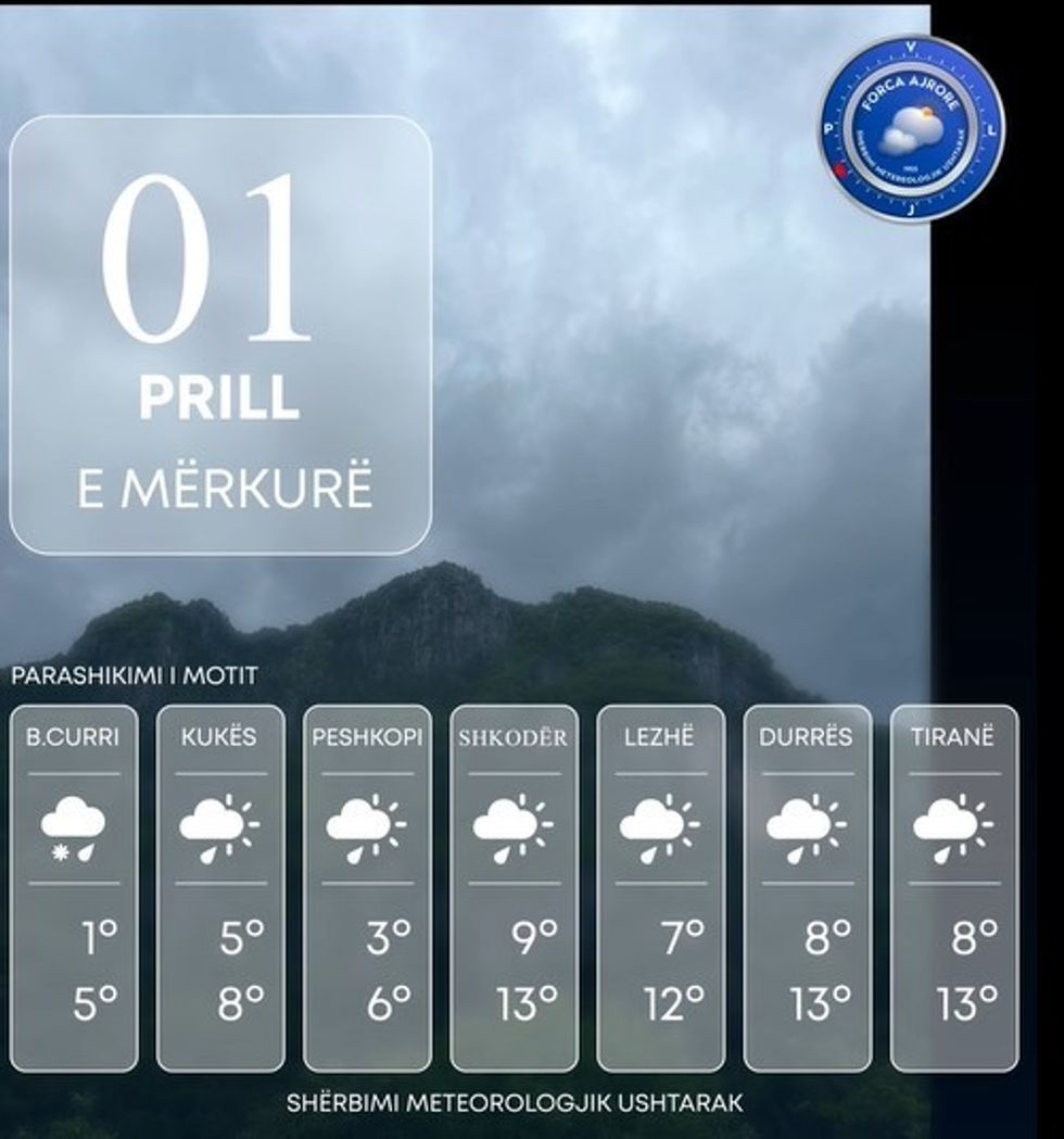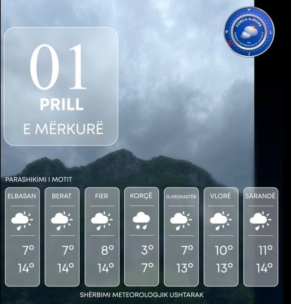Reshjet e herëpashershme të shiut parashikohen të bëhen prezentë që në orët e para të 24-orëshit me intensitet të ulët në pjesën më të madhe të territorit. Gjatë ditës reshjet e herëpashershme të shiut parashikohet të vijojnë me intensitet të ulët në pjesën më të madhe të territorit, lokalisht shtrëngata afatshkurtra.