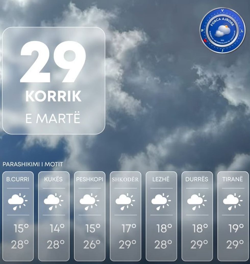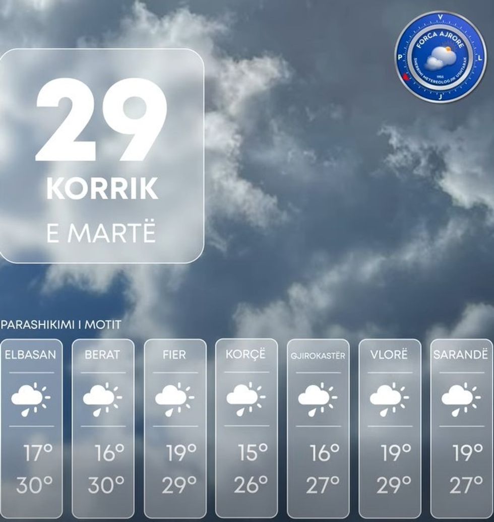 Shërbimi Meteorologjik Ushtarak bën të ditur se Shqipëria të martën do të jetë në ndikimin e kushteve atmosferike të paqëndrueshme.