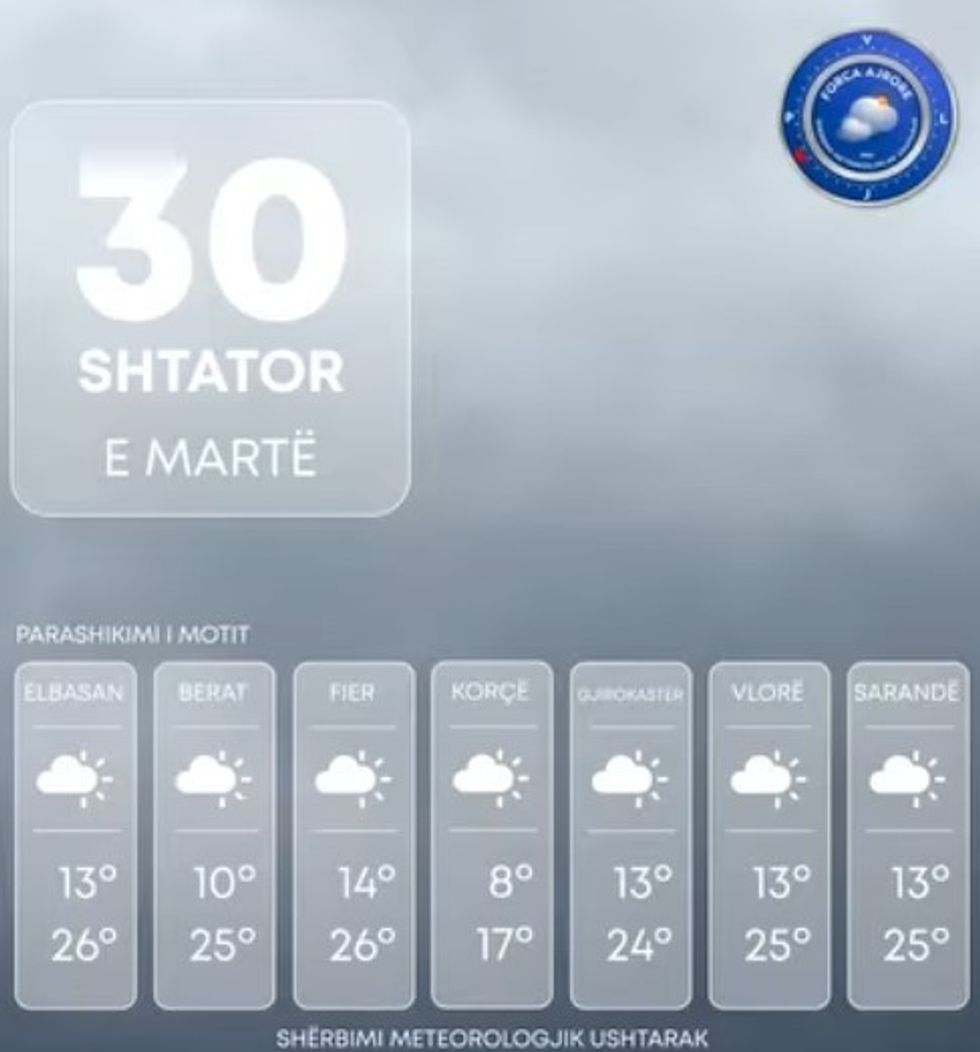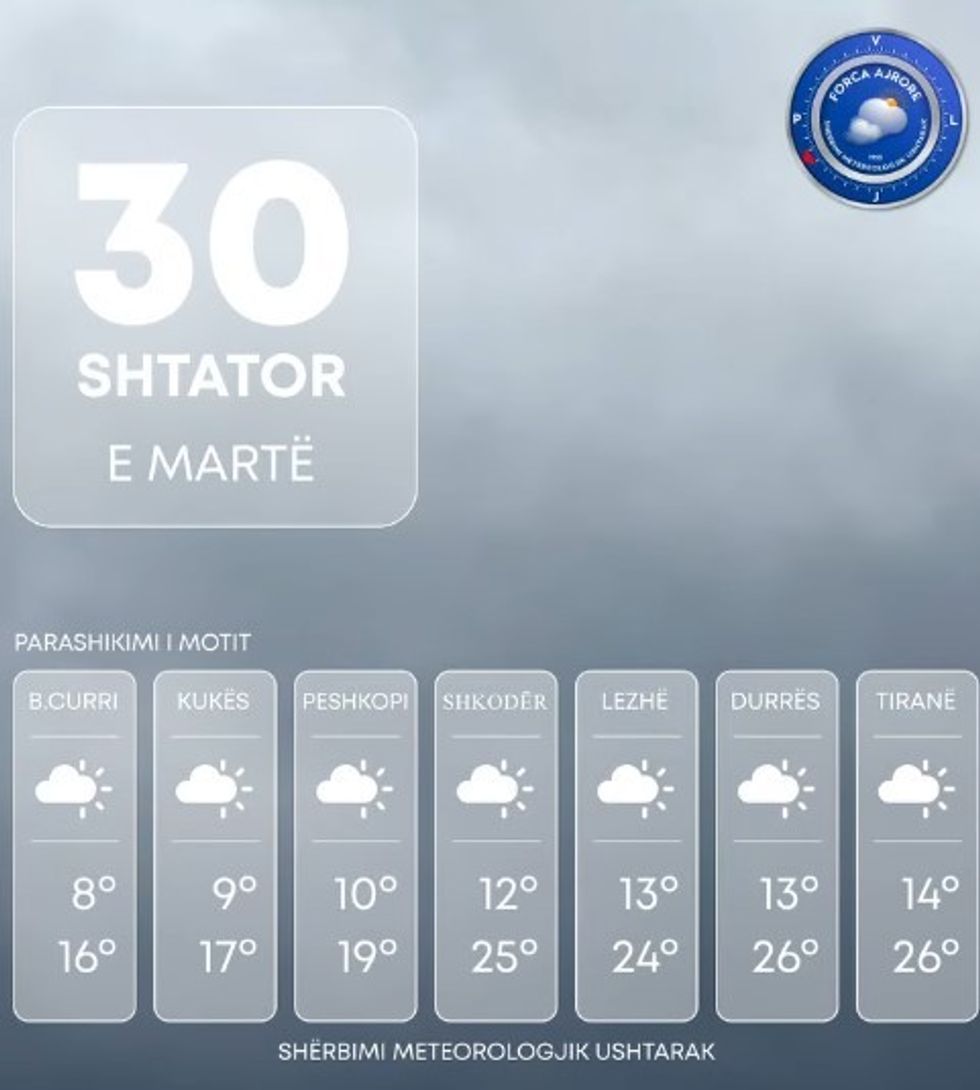 Shërbimi Meteorologjik Ushtarak bën të ditur se moti parashikohet me kthjellime e alternime vranësirash të pakta kalimtare në relievet malore në verilindje e juglindje të territorit.