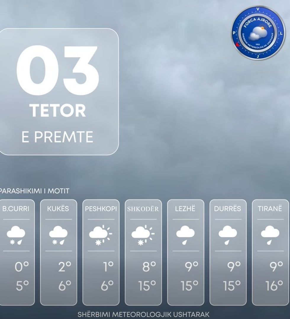 Shqipëria të premten do të ndikohet nga kushte atmosferike të paqëndrueshme.