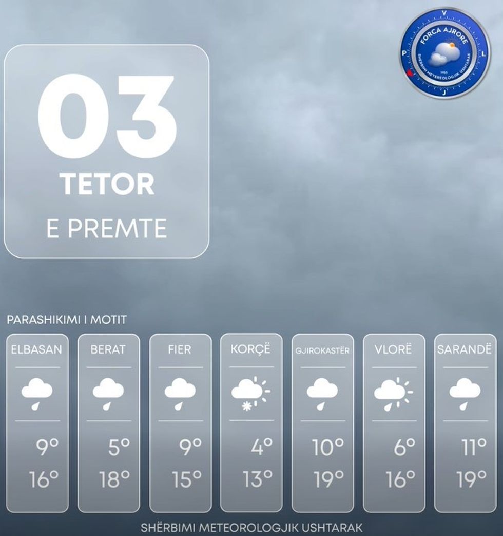 Shërbimi Meteorologjik Ushtarak bën të ditur se moti parashikohet kryesisht i vranët, dhe me reshje shiu me intensitet të ulët në një pjesë të madhe të territorit gjatë orëve të mëngjesit.