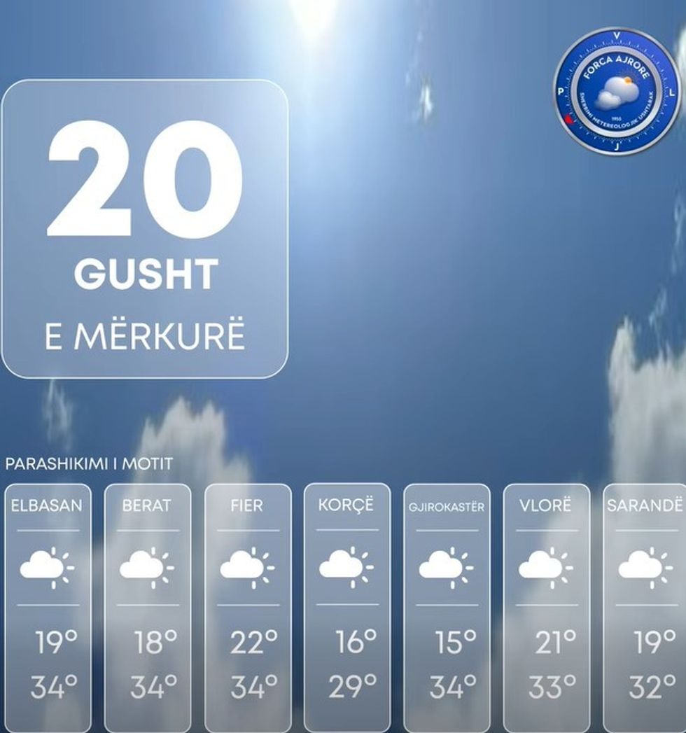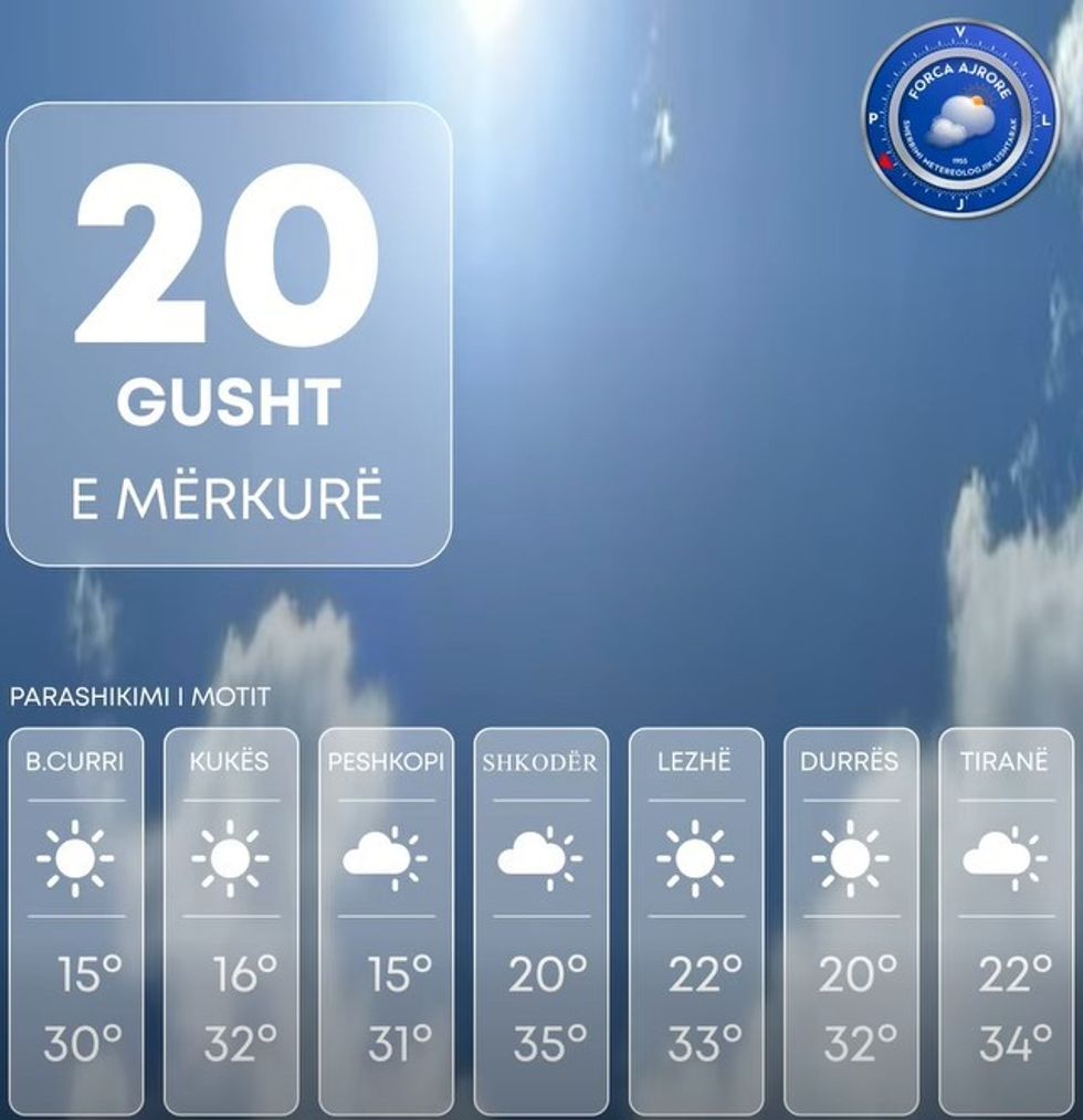 Shërbimi Meteorologjik Ushtarak bën të ditur se Shqipëria të mërkurën do të ndikohet nga kushte atmosferike të qëndrueshme.