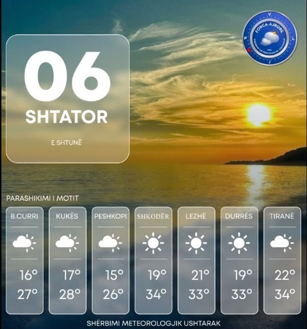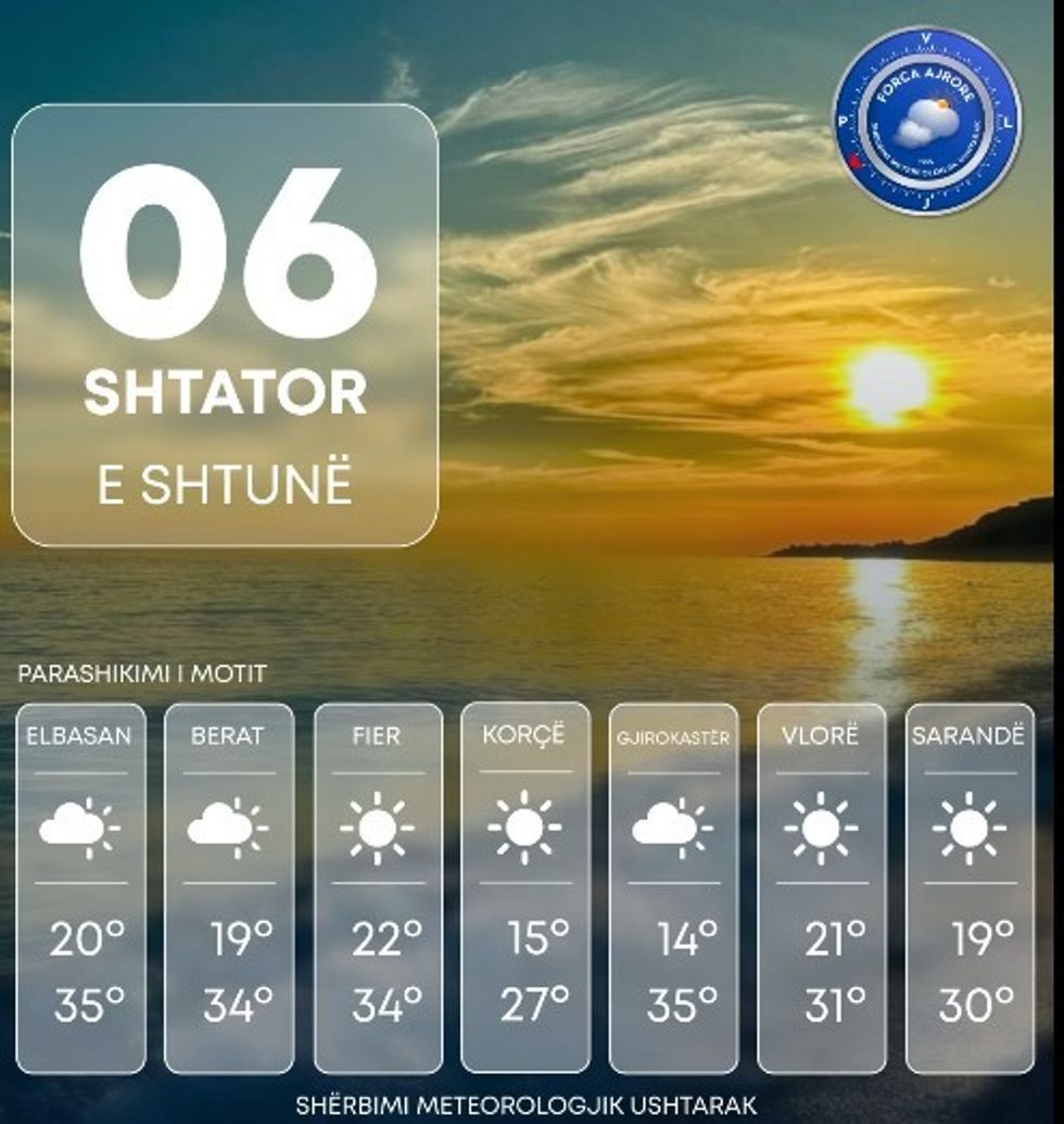 Shërbimi Meteorologjik Ushtarak bën të ditur se Shqipëria në fundjavë do të ndikohet nga kushte atmosferike të qëndrueshme.