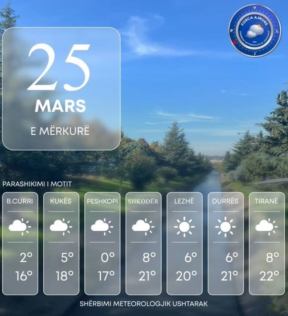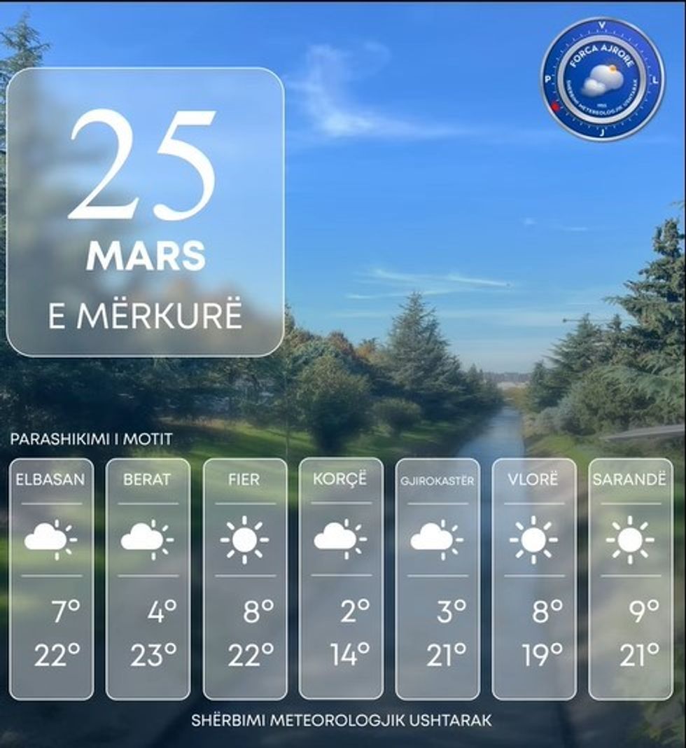 Shërbimi Meteorologjik Ushtarak bën të ditur se Shqipëria të mërkurën do të ndikohet nga kushte atmosferike të qëndrueshme.