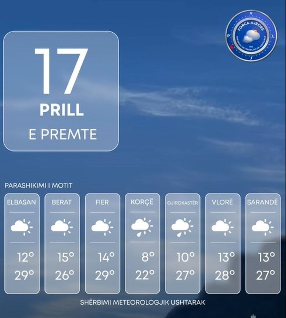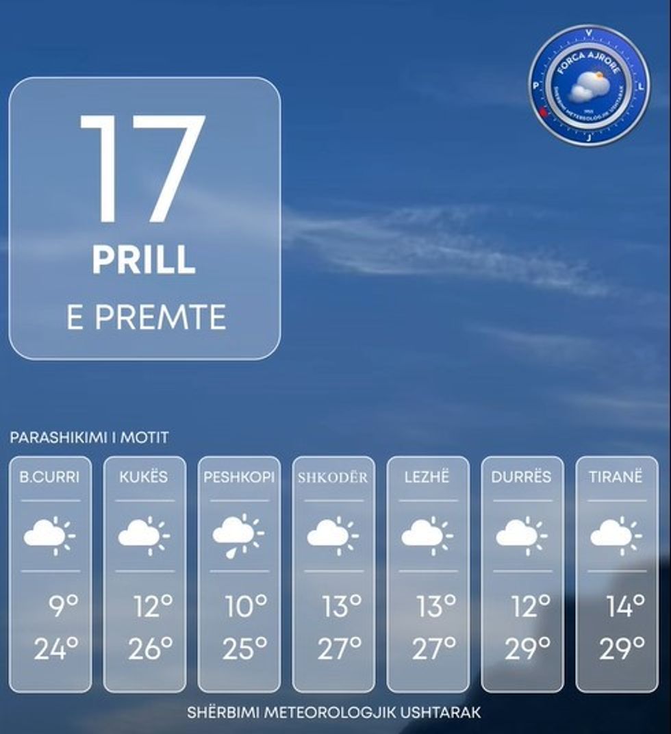 Shërbimi Meteorologjik Ushtarak bën të ditur se moti parashikohet të jetë me alternime kthjellimesh dhe vranësira të cilat priten të jenë kalimtare kryesisht në orët e mesditës.