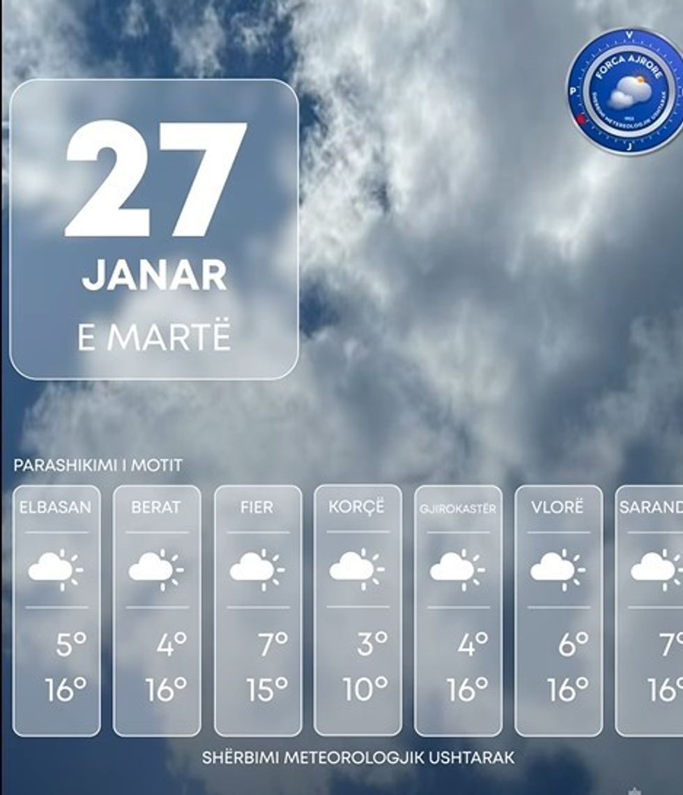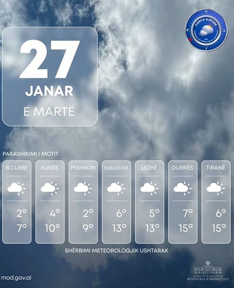 Shërbimi Meteorologjik Ushtarak bën të ditur se moti parashikohet me kthjellime dhe vranësira kryesisht përgjatë relieveve malore të vendit.
