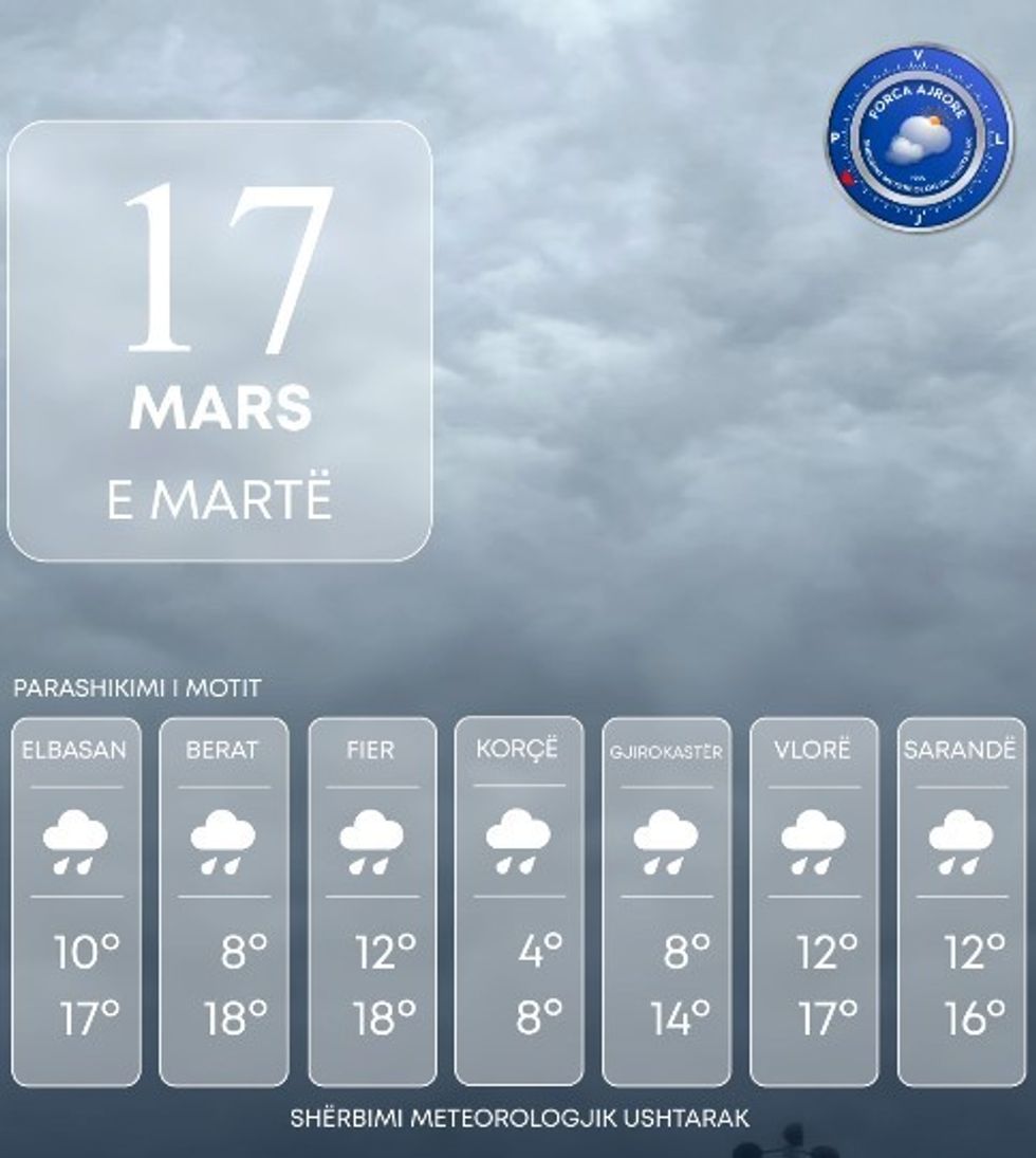 Shërbimi Meteorologjik Ushtarak njofton se moti parashikohet me vranësira mesatare deri të dendura. Reshjet e shiut pritet të bëhen prezentë në orët e mesditës me intensitet të ulët në zonën e jugut dhe pjesërisht qendër.