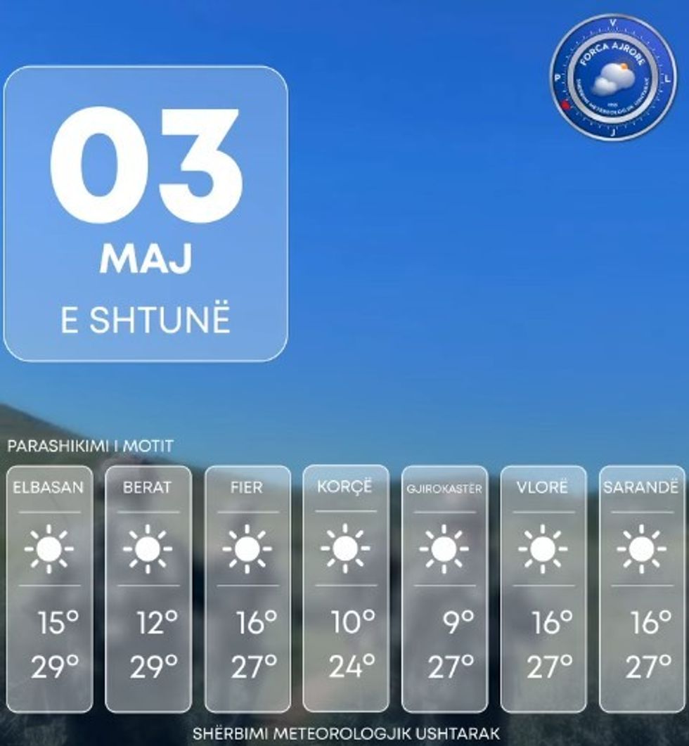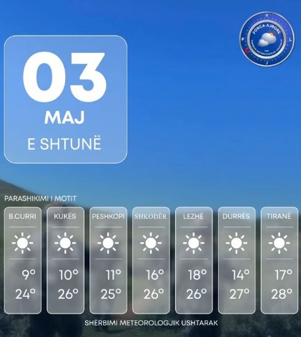 Shërbimi Meteorologjik Ushtarak bën të ditur se të shtunën në Shqipëri do të mbajë mot i qëndrueshëm.