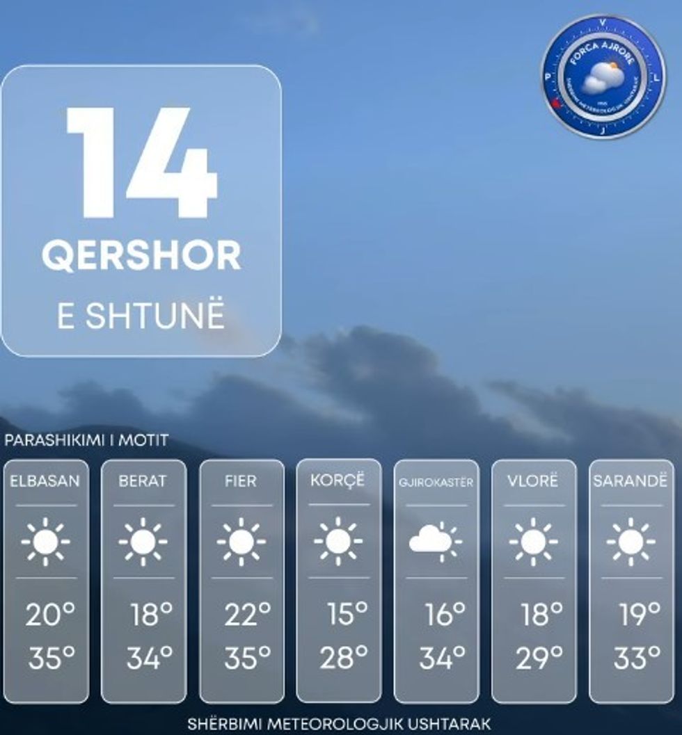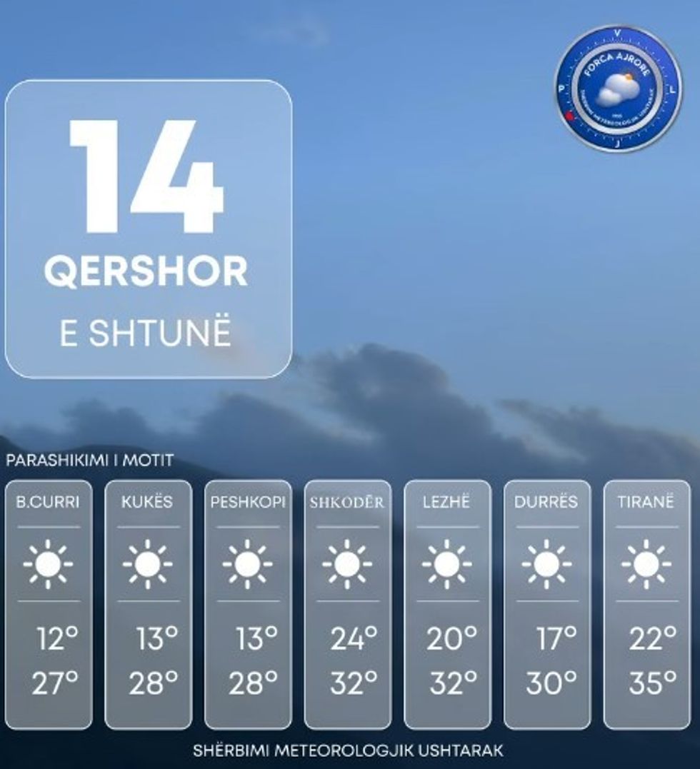Temperaturat minimale do të lëvizin ndërmjet 12 dhe 22 gradë Celsius, ndërkaq maksimalet nga 27 deri në 35 gradë.