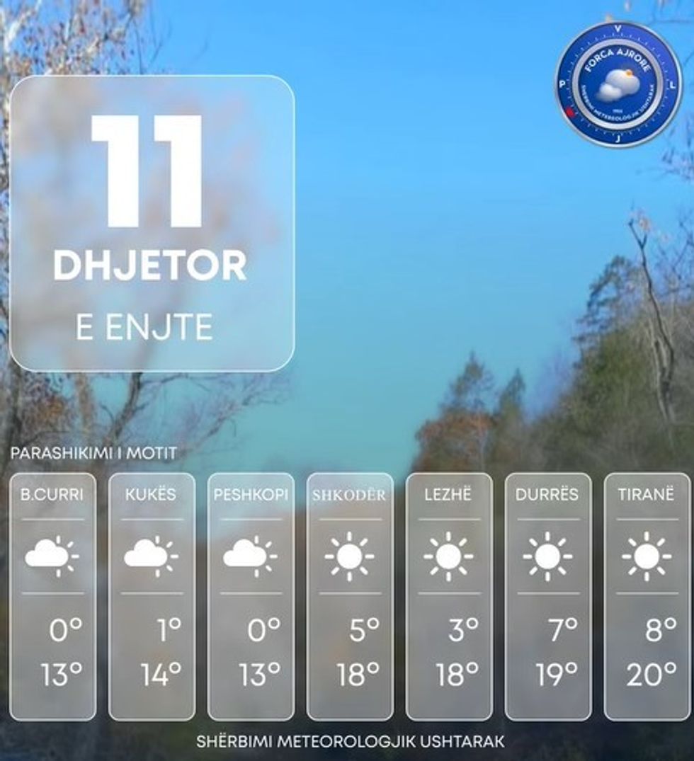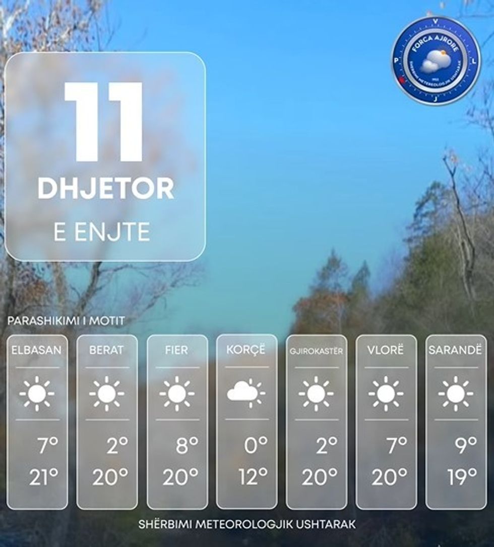 Shërbimi Meteorologjik Ushtarak bën të ditur se Shqipëria të enjten do të ndikohet nga kushte atmosferike të qëndrueshme.