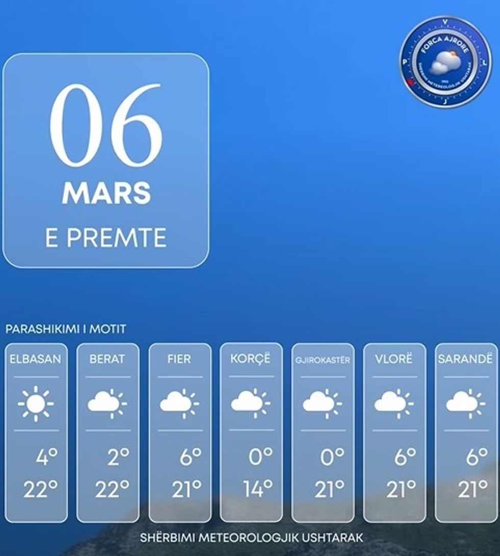 Shërbimi Meteorologjik Ushtarak bën të ditur se sot Shqipëria do të ndikohet nga kushte atmosferike të qëndrueshme.