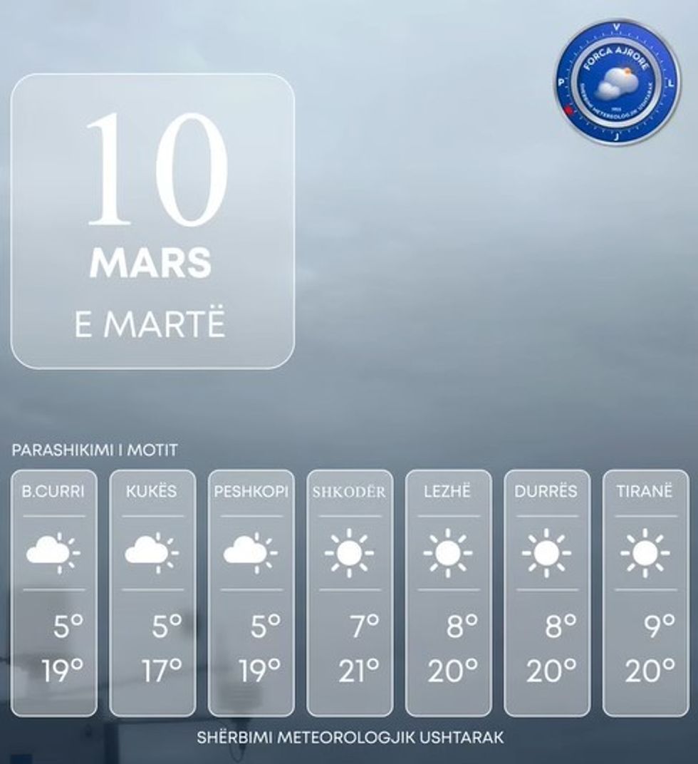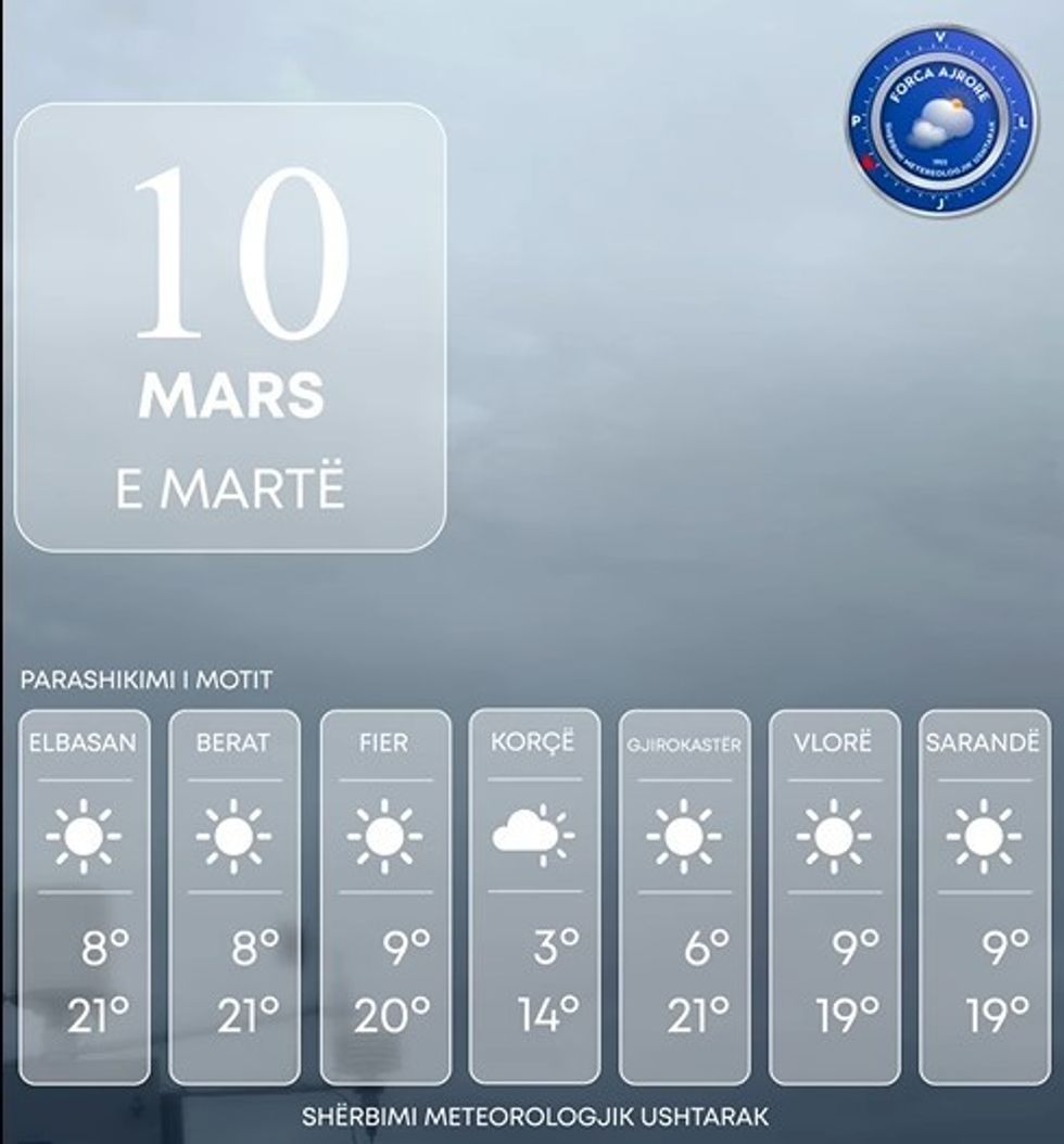 Shërbimi Meteorologjik Ushtarak bën të ditur se Shqipëria të mërkurën do të ndikohet nga kushte të qëndrueshme atmosferike.