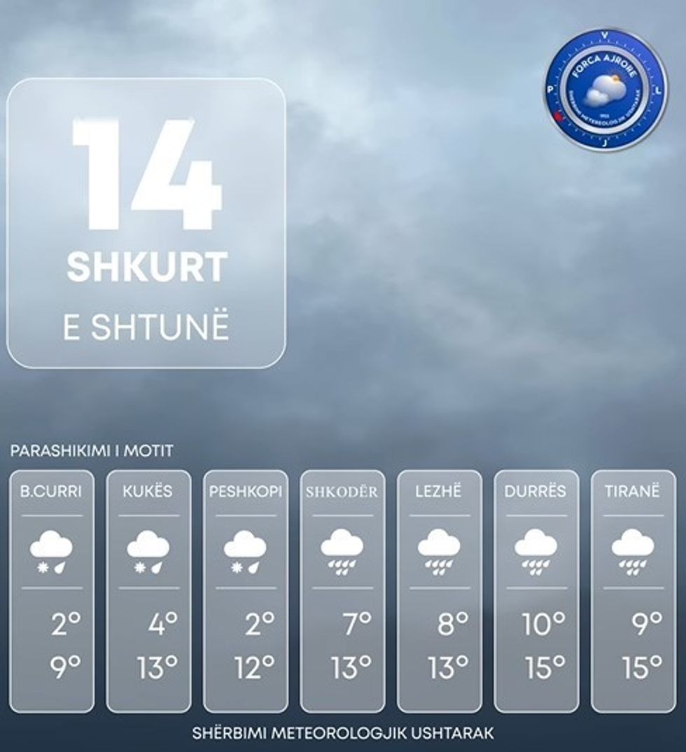 Reshjet e shiut parashikohen të bëhen prezentë në orët e mëngjesit fillimisht përgjatë vijës bregdetare e gradualisht do të shtrihen edhe në pjesën tjetër të vendit me intensitet të ulët. Në orët e pasdites deri në mbrëmje vonë reshjet e shiut pritet të jenë me intensitet mesatar në pjesën më të madhe të territorit, hera-herës shtrëngata afatshkurtra.