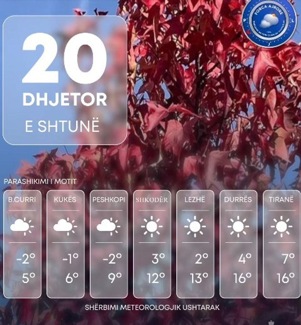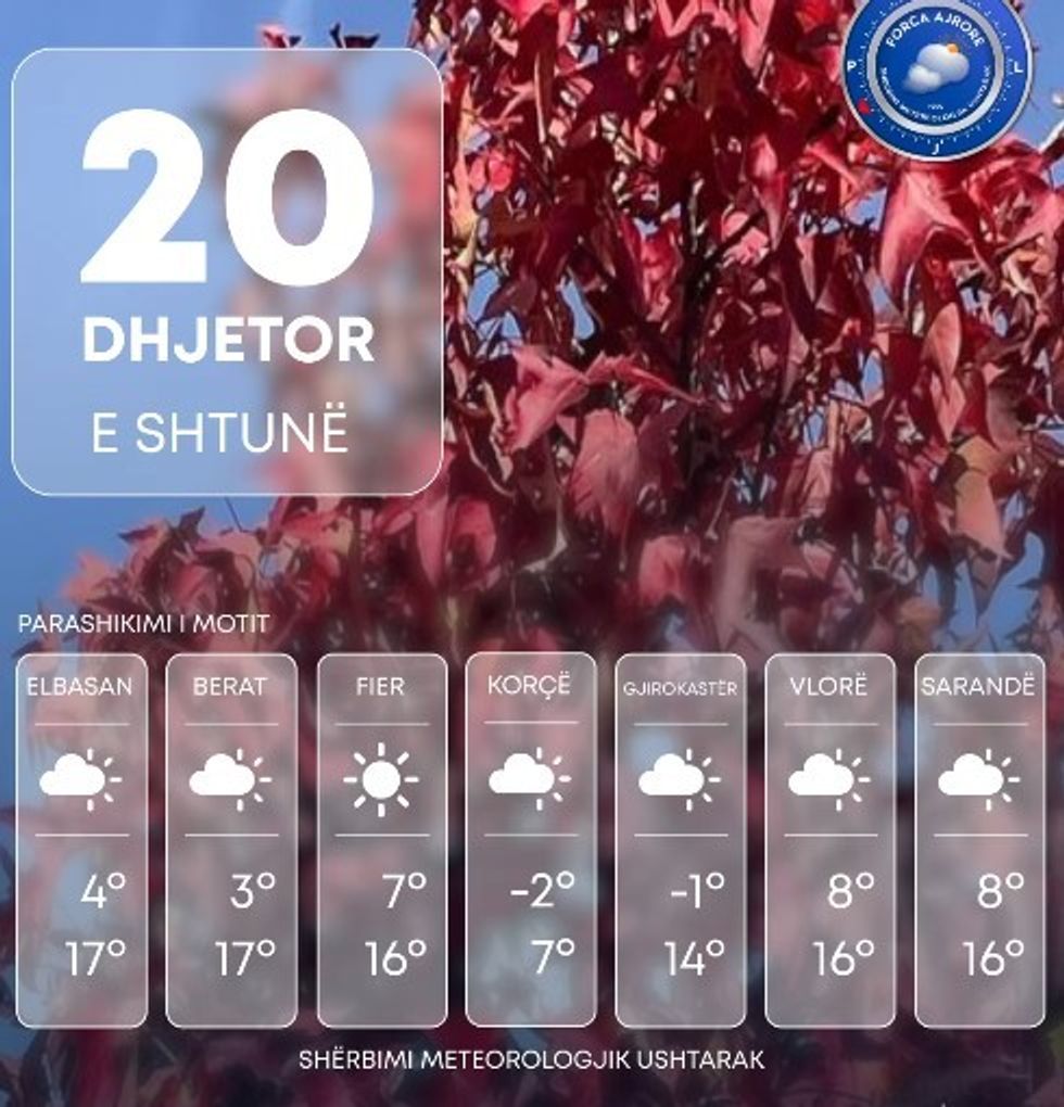 Shërbimi Meteorologjik Ushtarak bën të ditur se Shqipëria do të ndikohet nga kushte atmosferike të kryesisht të qëndrueshme.