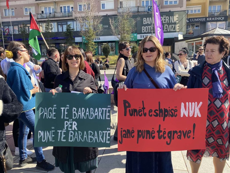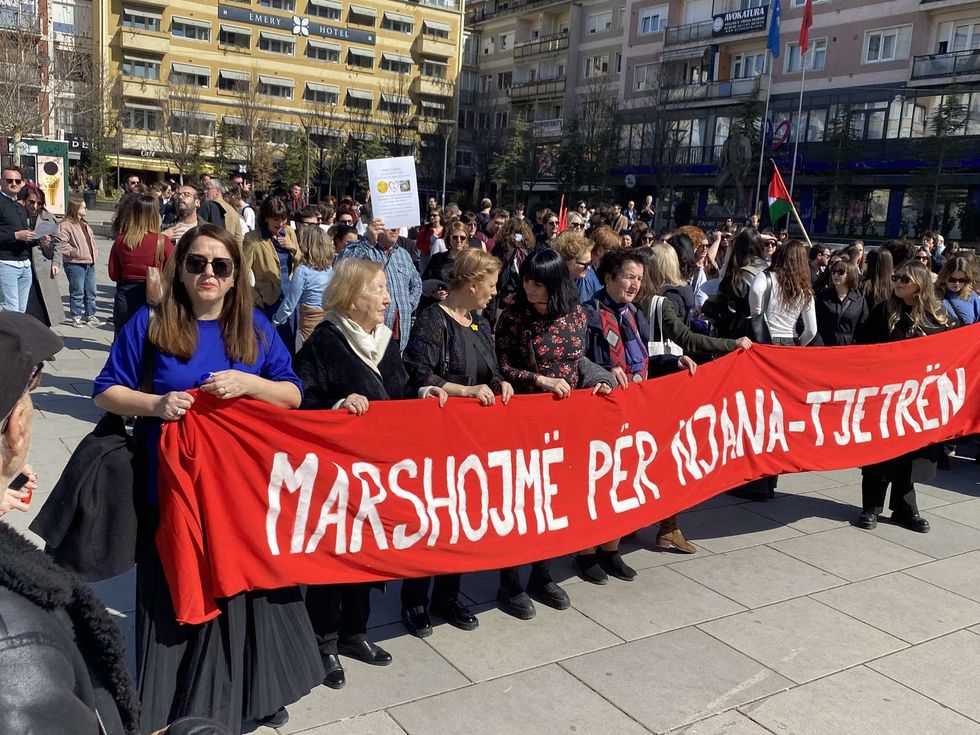 “Grua”, “Nata s’ka ispat”, “Jetë”, “Liri”, “Drejtësia e vonuar është padrejtësi”, “Punët e shtëpisë nuk janë punët e grave”, janë mbishkrimet që gratë dhe burrat po mbajnë në duart e tyre, në marshin tradicional