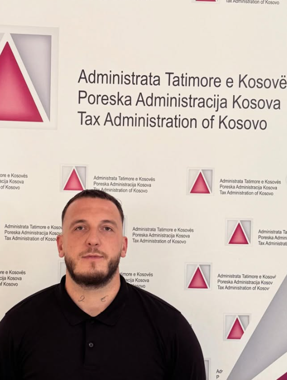 Në një nga imazhet e këtij postimi, Gramos Aliu (emri i vërtetë), shihet duke pozuar pranë Administratës Tatimore të Kosovës.