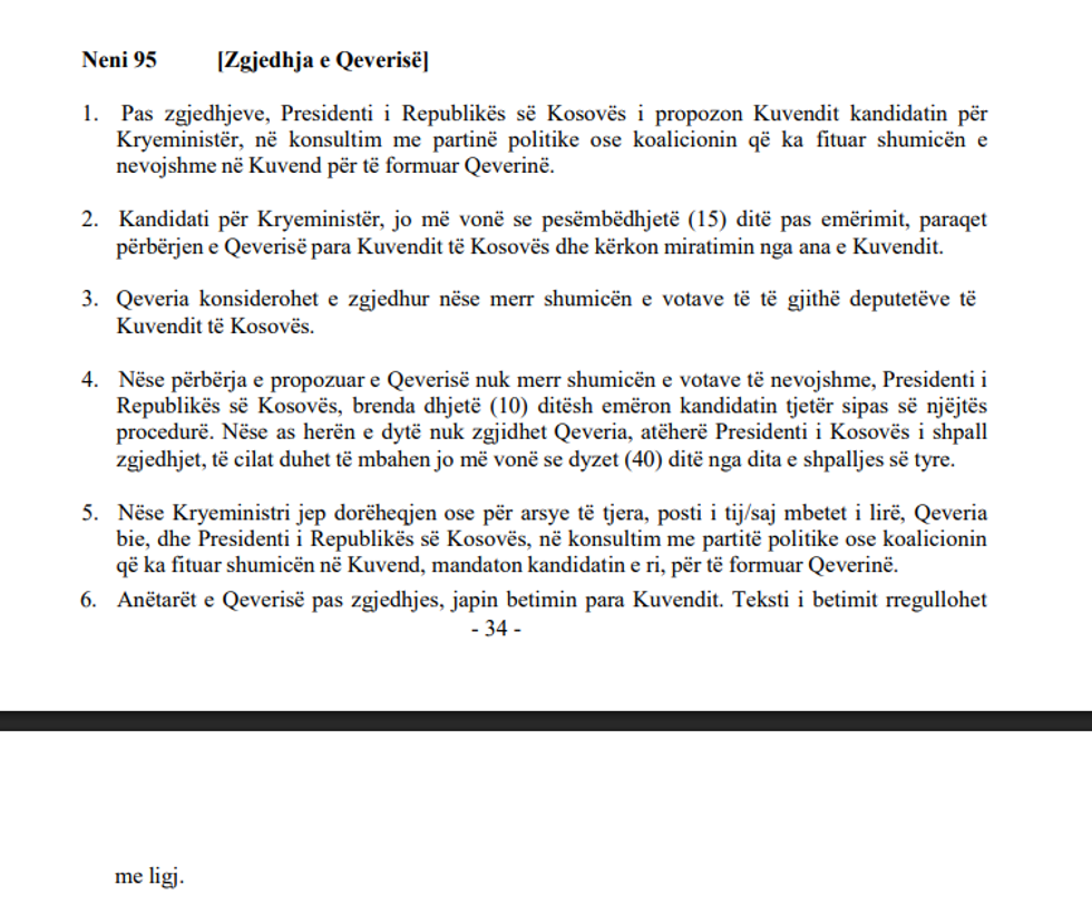 Ky proces është përaparë edhe në Nenin 95 të Kushtetutës së Kosovës, i cili rregullon procedurat pas zgjedhjes së qeverisë dhe mandateve të Kryeministrit.