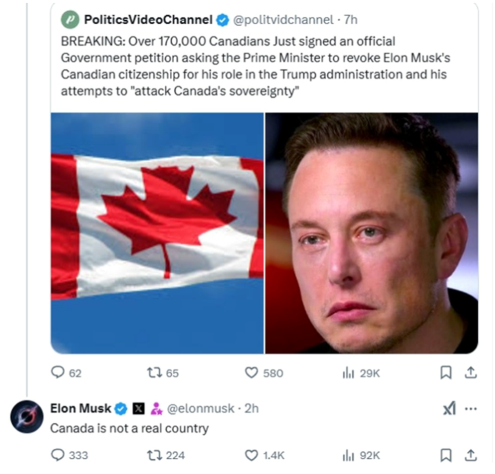 Në përgjigje të lajmit për peticionin, Musk shkroi në rrjetin social X se "Kanada nuk është një shtet i vërtetë".