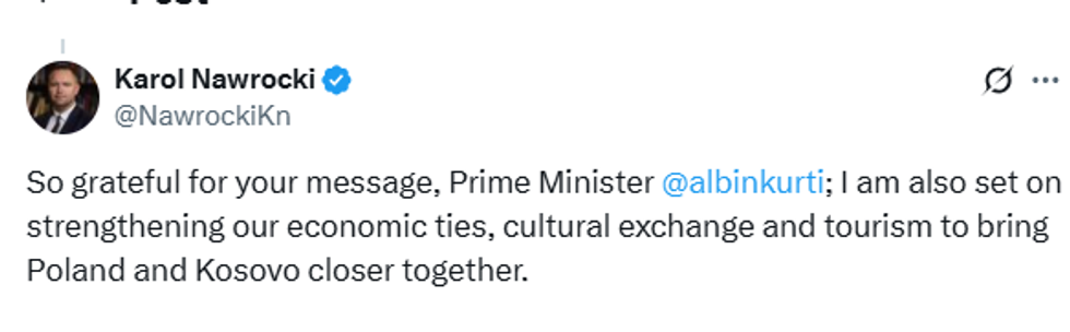 "Jam shumë mirënjohës për mesazhin tuaj, kryeministër Albin Kurti. Edhe unë jam i përkushtuar për të forcuar lidhjet tona ekonomike, shkëmbimin kulturor dhe turizmin, për të afruar edhe më shumë Poloninë dhe Kosovën", ka deklaruar presidenti polak. /Telegrafi/