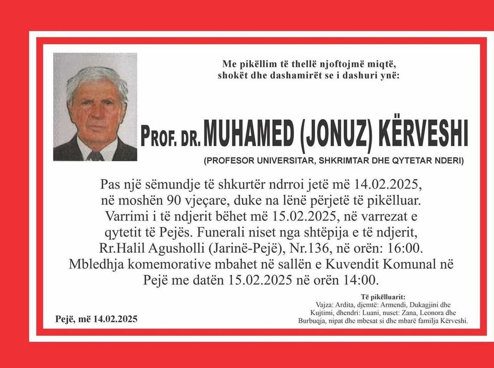 “Me pikëllim të thellë Ju njoftojmë se, sot, pas një sëmundje të rëndë, ndërroj jetë babai, gjyshi, Prof.Dr. Muhamed Kërveshi në moshën 90 vjecare, duke na lënë përjetësisht të pikëlluar! Zemra e tij pushoj e qetë dhe pranë më të dashurve! Babi ishte profesor i Universitetit të Prishtinës deri në pensionim”, thuhet në njoftimin e familjarëve.