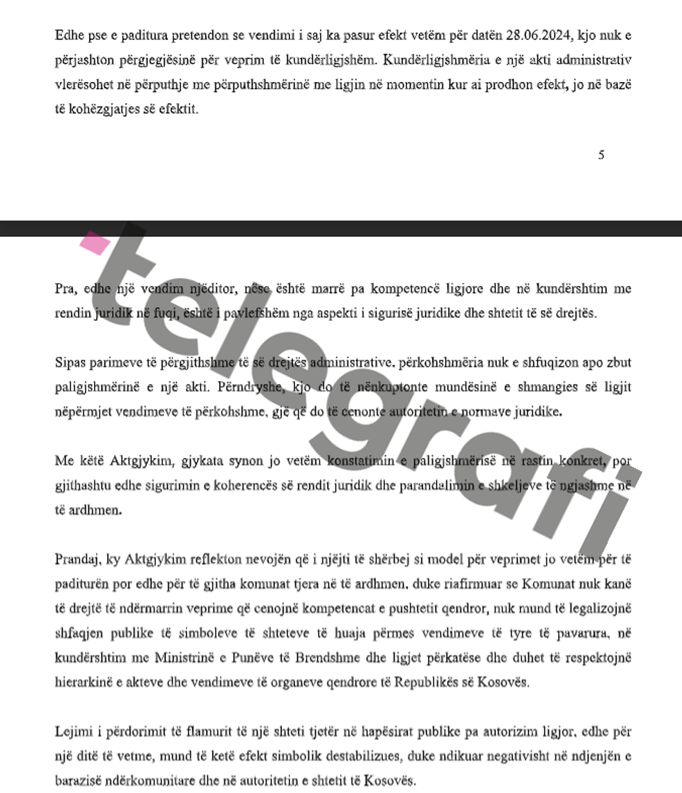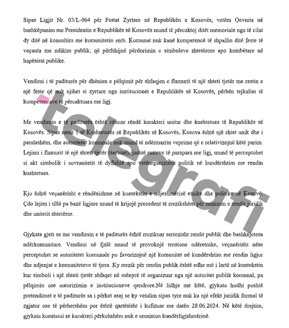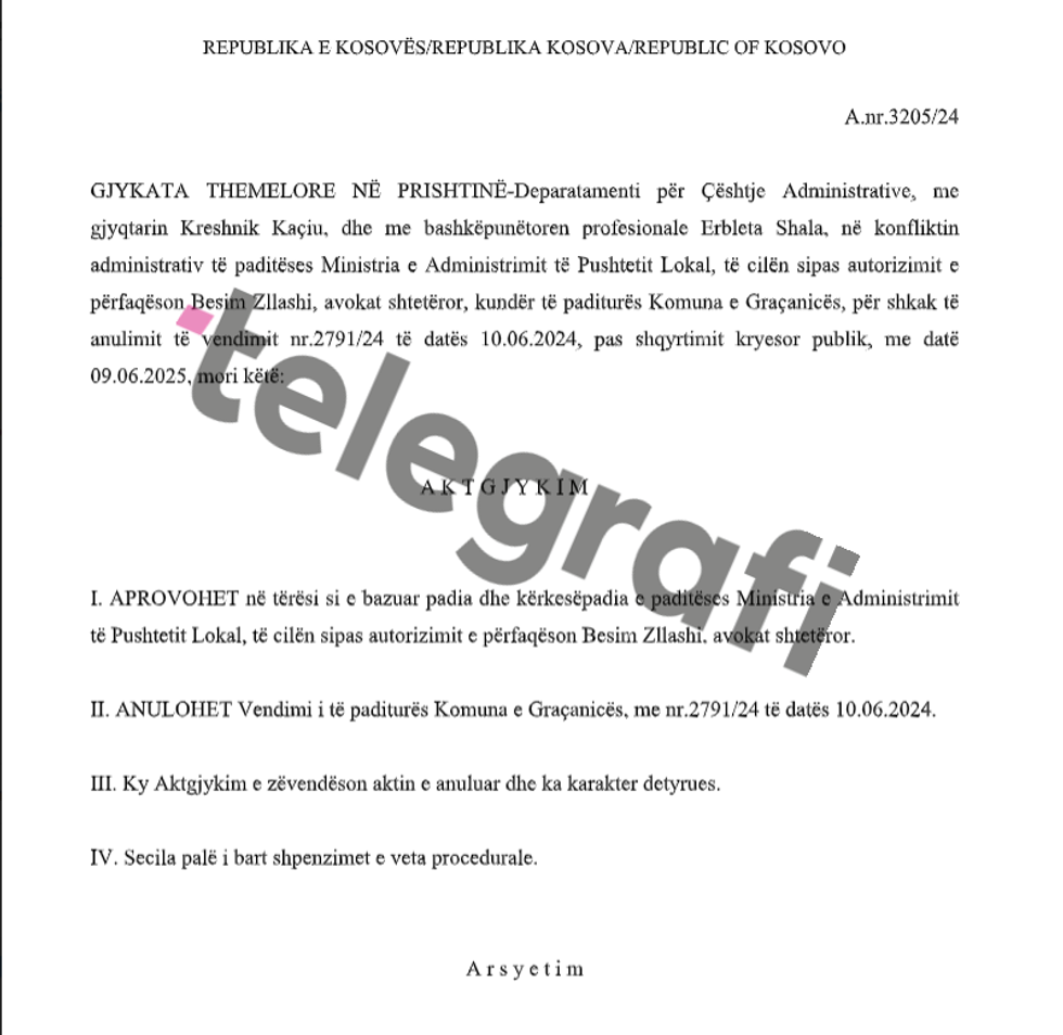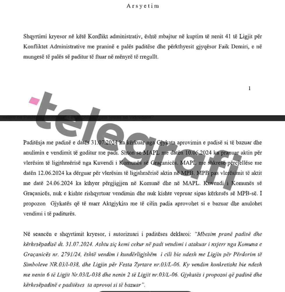 Sipas dokumentit të siguruar nga Telegrafi, Gjykata Themelore ka aprovuar në tërësi padinë e MAPL-së dhe ka anuluar vendimin e Komunës së Graçanicës.