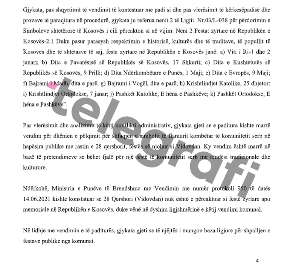 Ky vendim erdhi pas një padie të ngritur nga Ministria e Administrimit të Pushtetit Lokal (MAPL) ndaj Komunës së Graçanicës, e cila kishte miratuar më parë një vendim që lejonte përdorimin e simboleve serbe në ceremonitë e Vidovdanit.