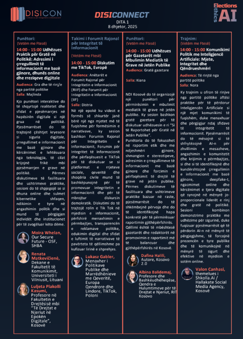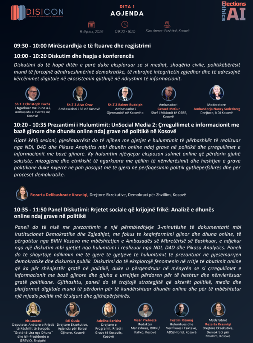 Instituti Kombëtar Demokratik (NDI) në Kosovë organizon edicionin e nëntë të Konferencës për Integritetin e Informacionit, DISICON 9, me temën e përgjithshme “Zgjedhjet, Inteligjenca Artificiale dhe Etika”.