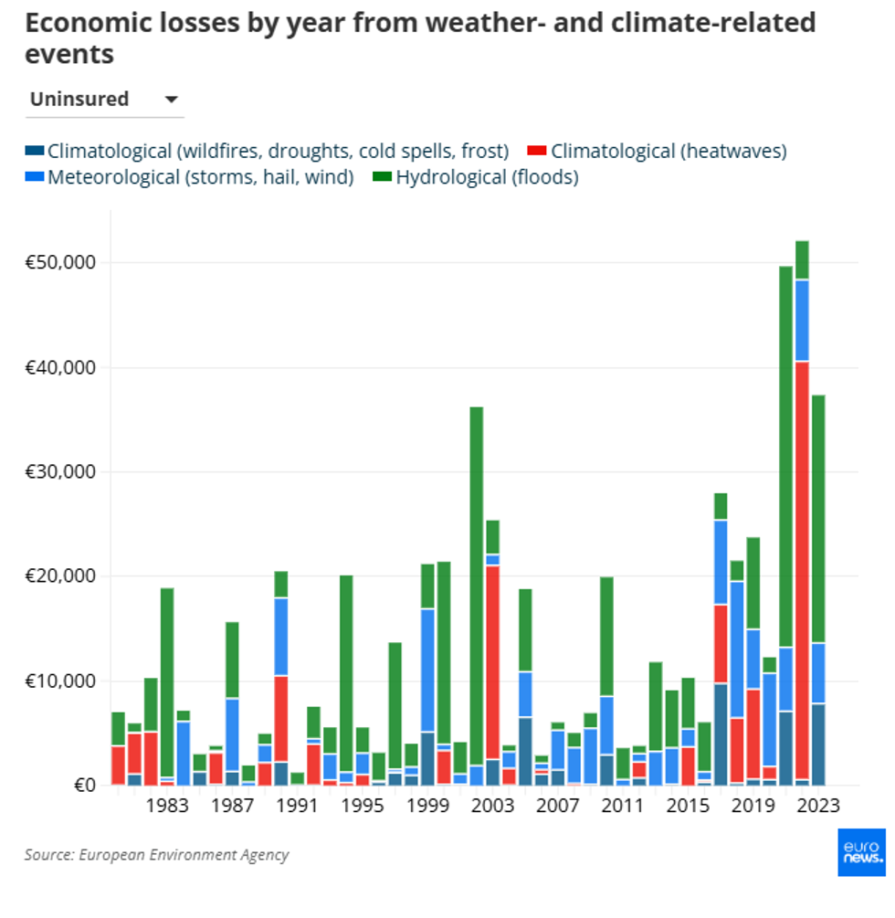 Në periudhën 1980–2023, Evropa ka përjetuar më shumë se 790 miliardë euro humbje ekonomike të shkaktuara nga ngjarje ekstreme të motit dhe fenomene klimatike.