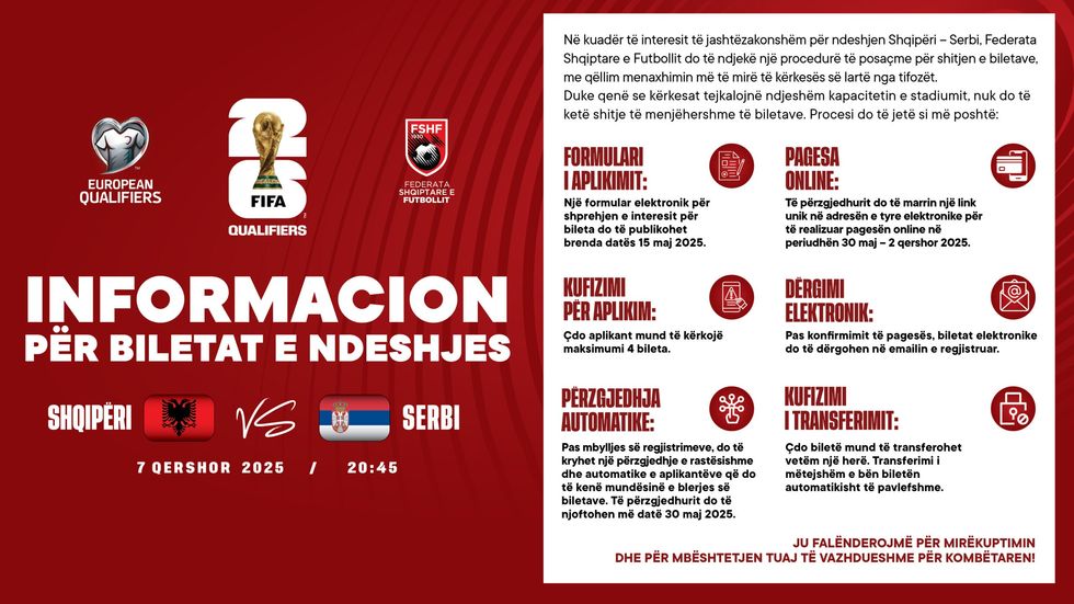 Për shkak të interesit të jashtëzakonshëm për ndeshjen Shqipëri – Serbi, e vlefshme për kualifikueset e Kampionatit Botëror 2026, Federata e Futbollit njofton se do të ndjekë një procedurë të posaçme për shitjen e biletave, me qëllim menaxhimin sa më efikas të kërkesës së lartë nga tifozët shqiptarë.